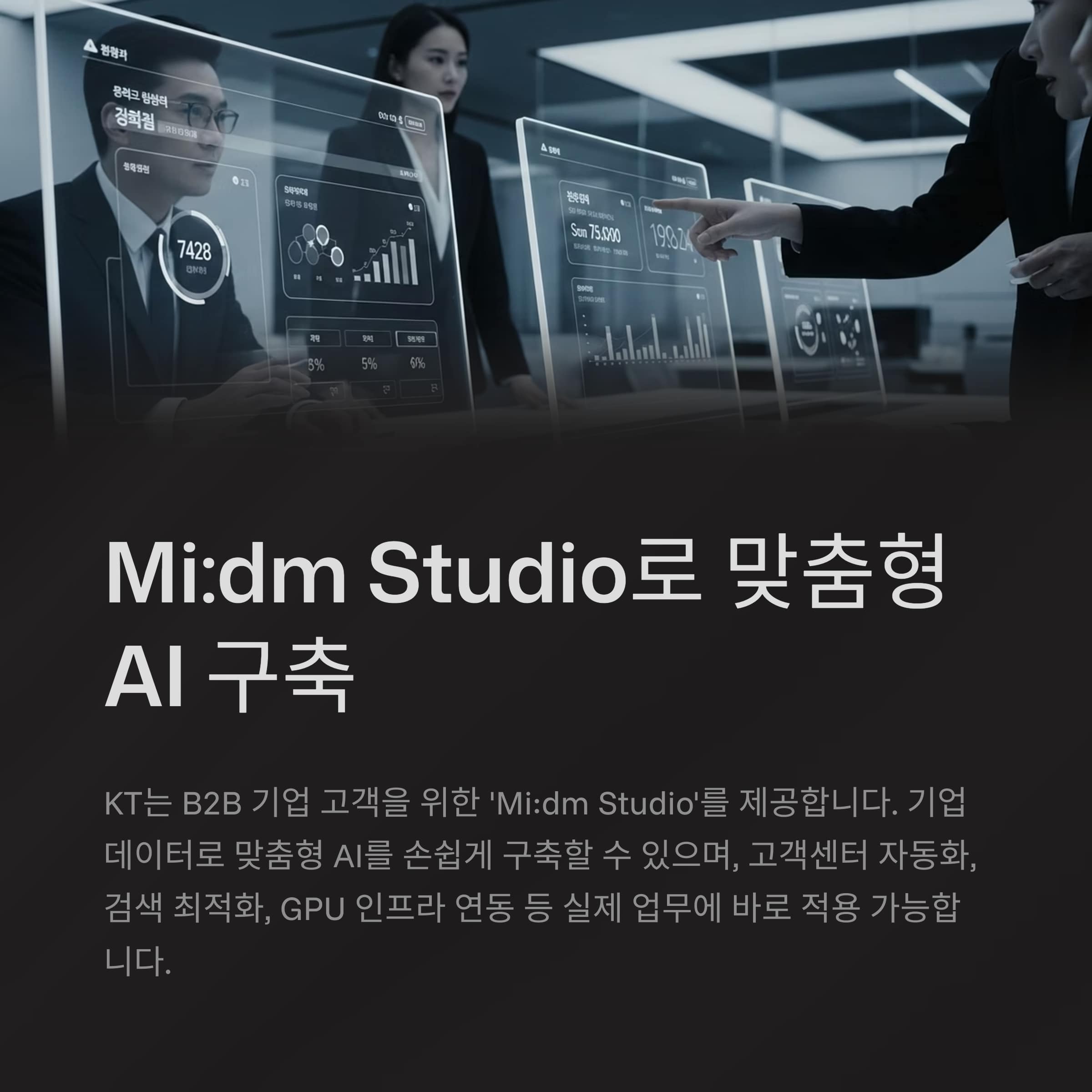 KT는 B2B 기업 고객을 위해 ‘Mi:dm Studio’를 별도로 제공하고 있습니다.