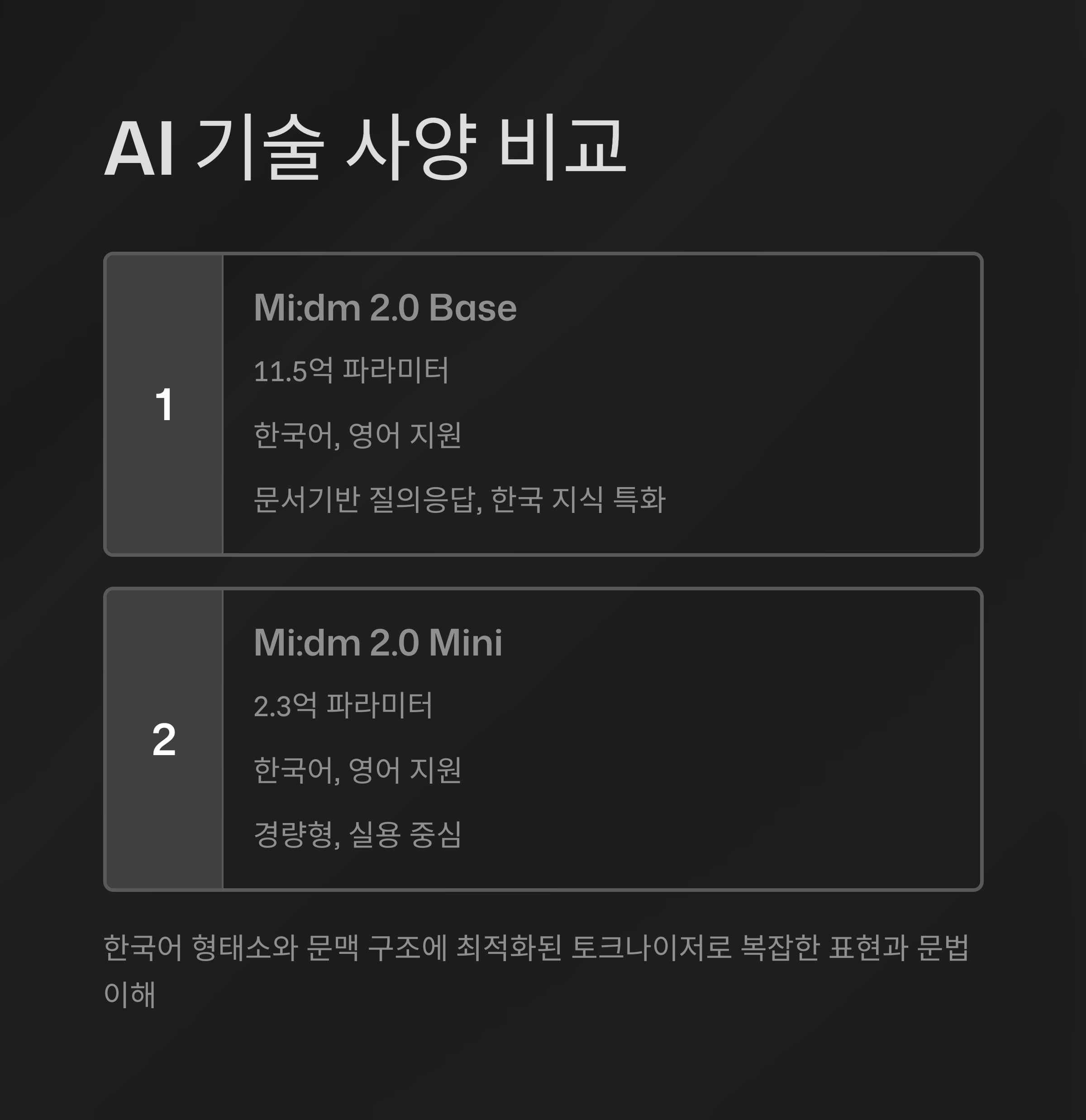 | Mi:dm 2.0 Mini | 2.3억 | 한국어, 영어 | 경량형, 실용 중심 |