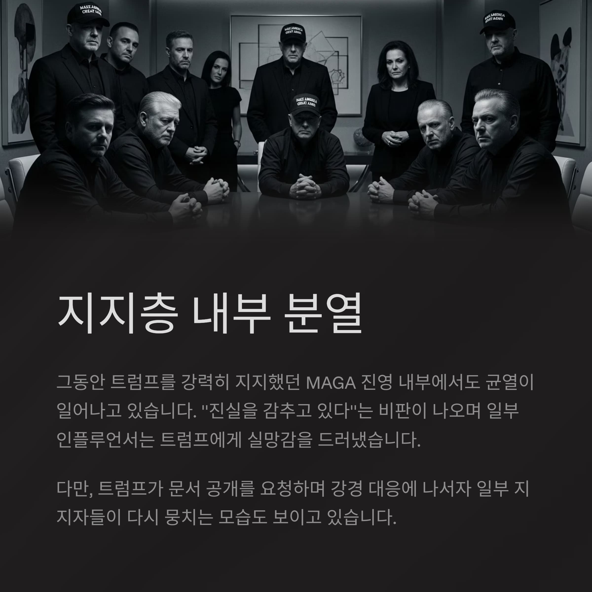 | 지지층 내부 갈등 | MAGA 진영 내 균열, 지지 기반 약화 조짐 |