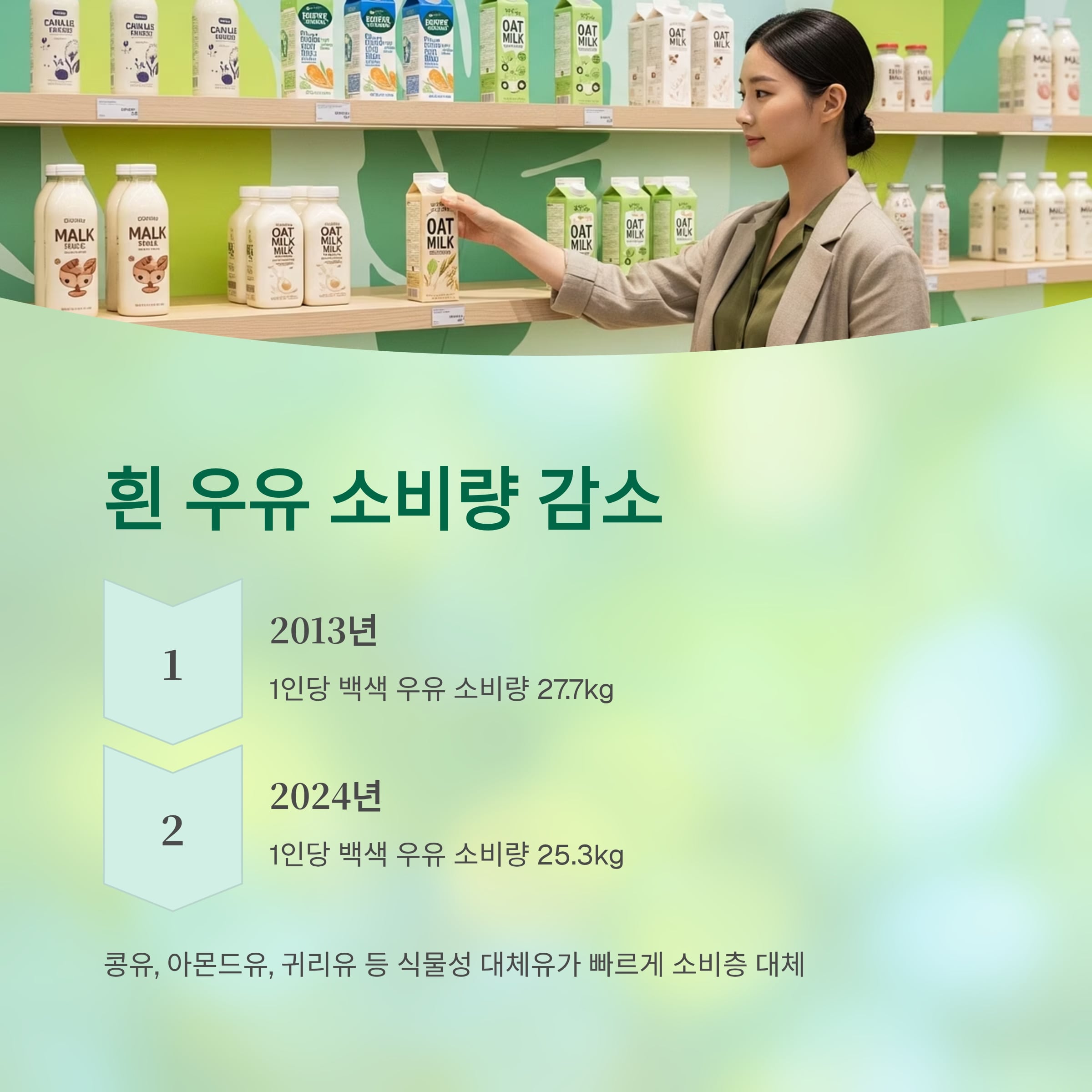 콩유, 아몬드유, 귀리유 등 식물성 대체유가 빠르게 소비층을 대체하고 있습니다.