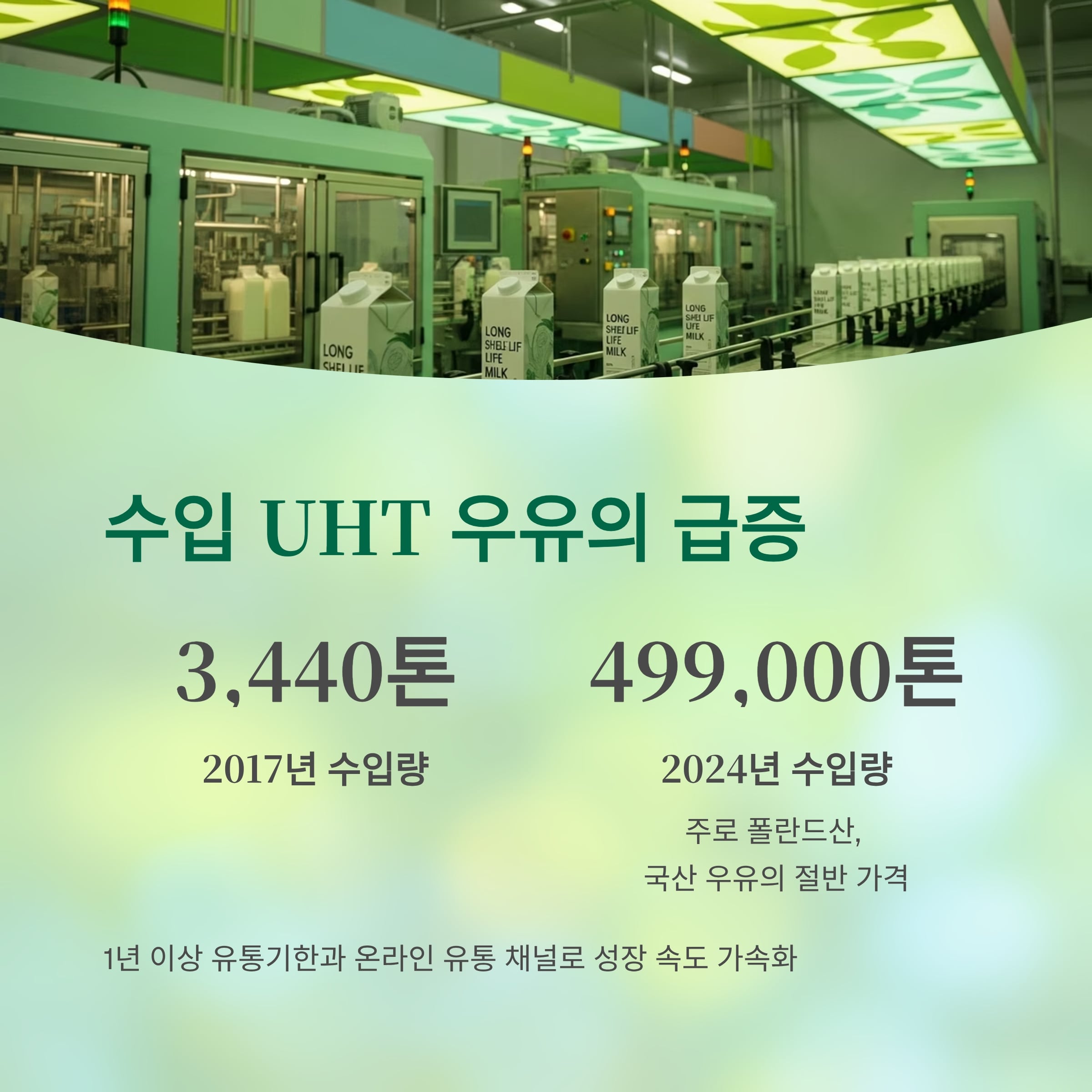 2024년 현재 수입 UHT 우유는 49만 9천 톤 규모에 달하며, 이 중 대부분이 폴란드산입니다.