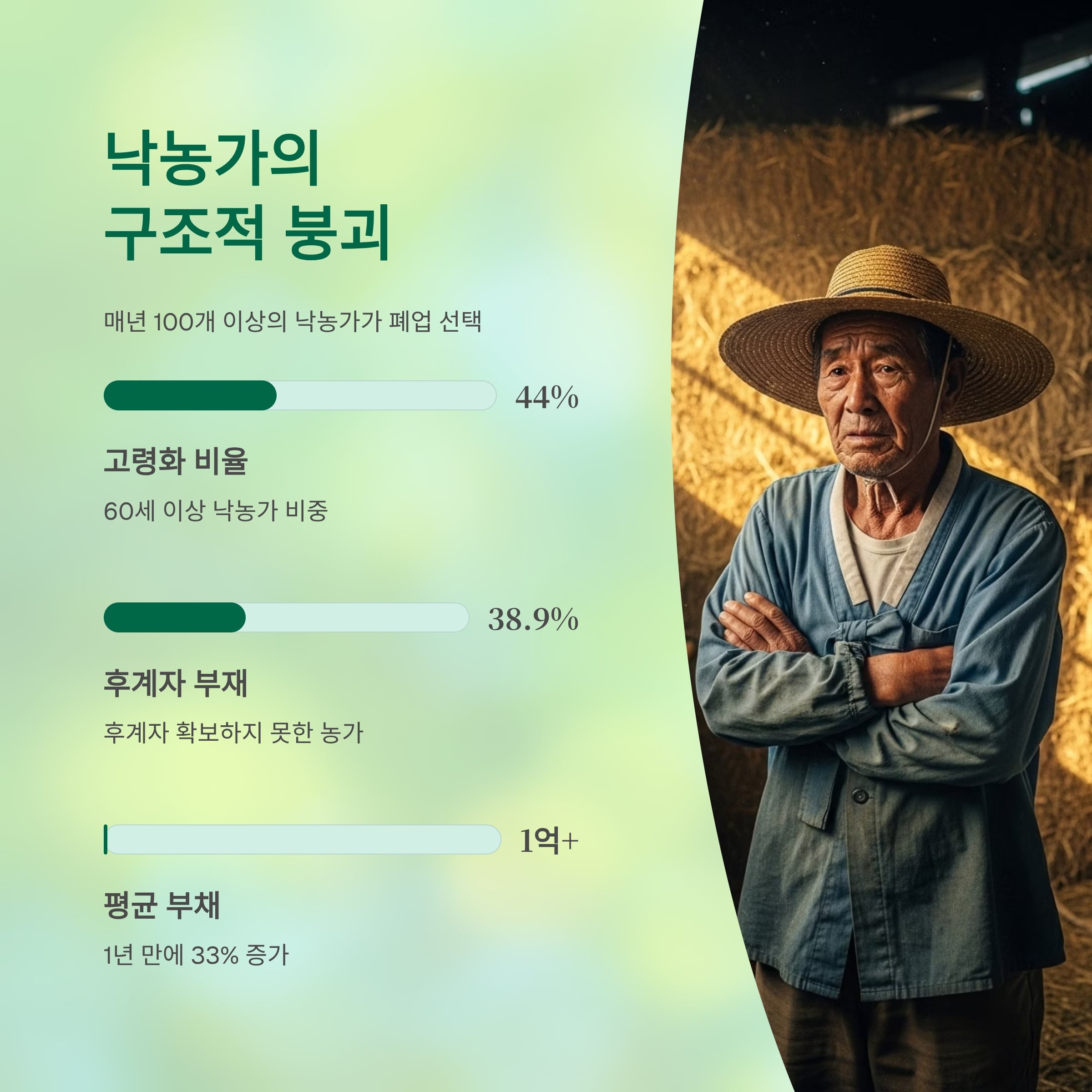 게다가 농가 평균 부채는 1억 원을 넘으며, 이는 1년 만에 33% 증가한 수치입니다.