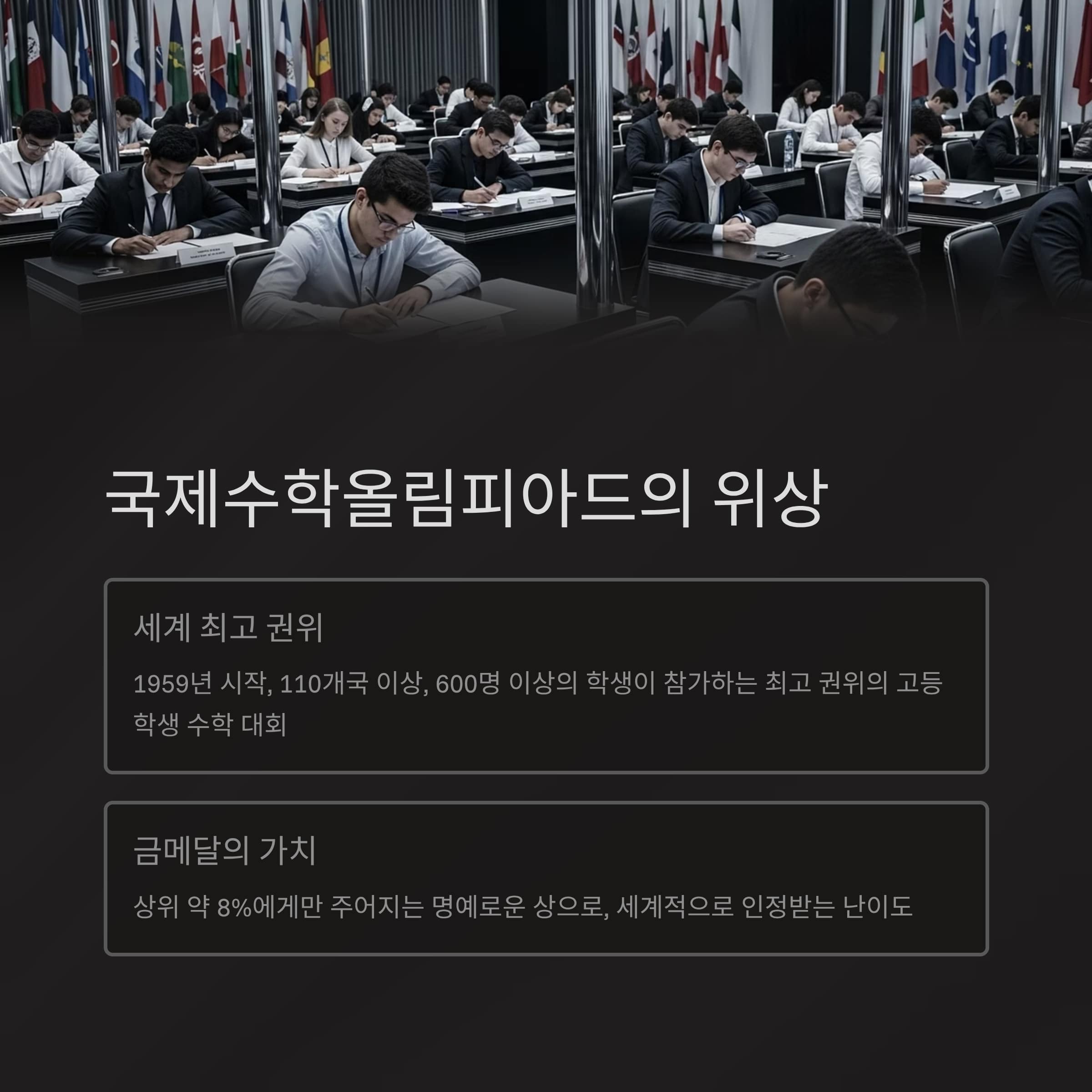 IMO는 1959년 시작되어 현재 110개국 이상, 600명 이상의 학생이 참가하는 세계 최고 권위의 고등학생 수학 대회입니다.