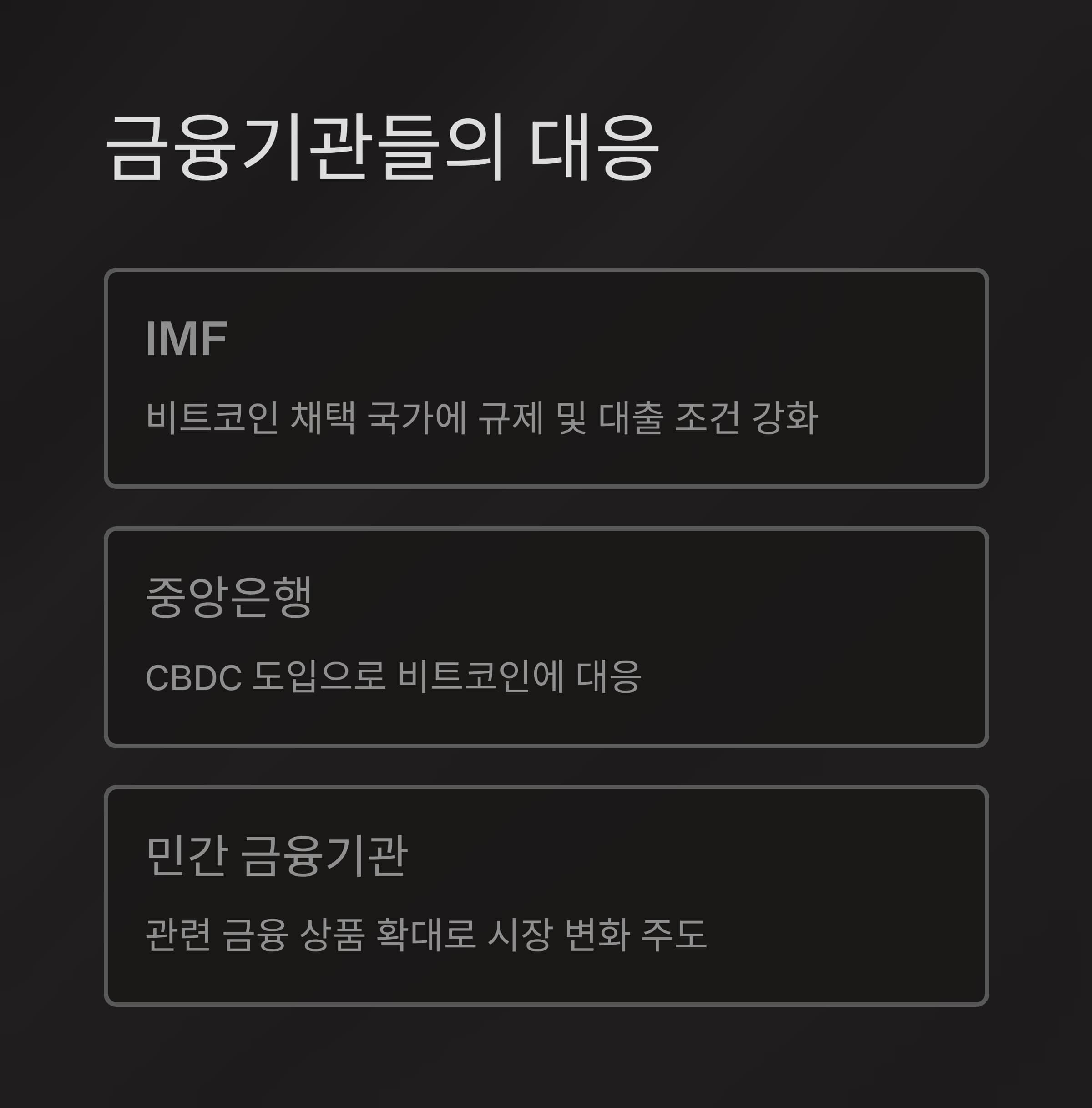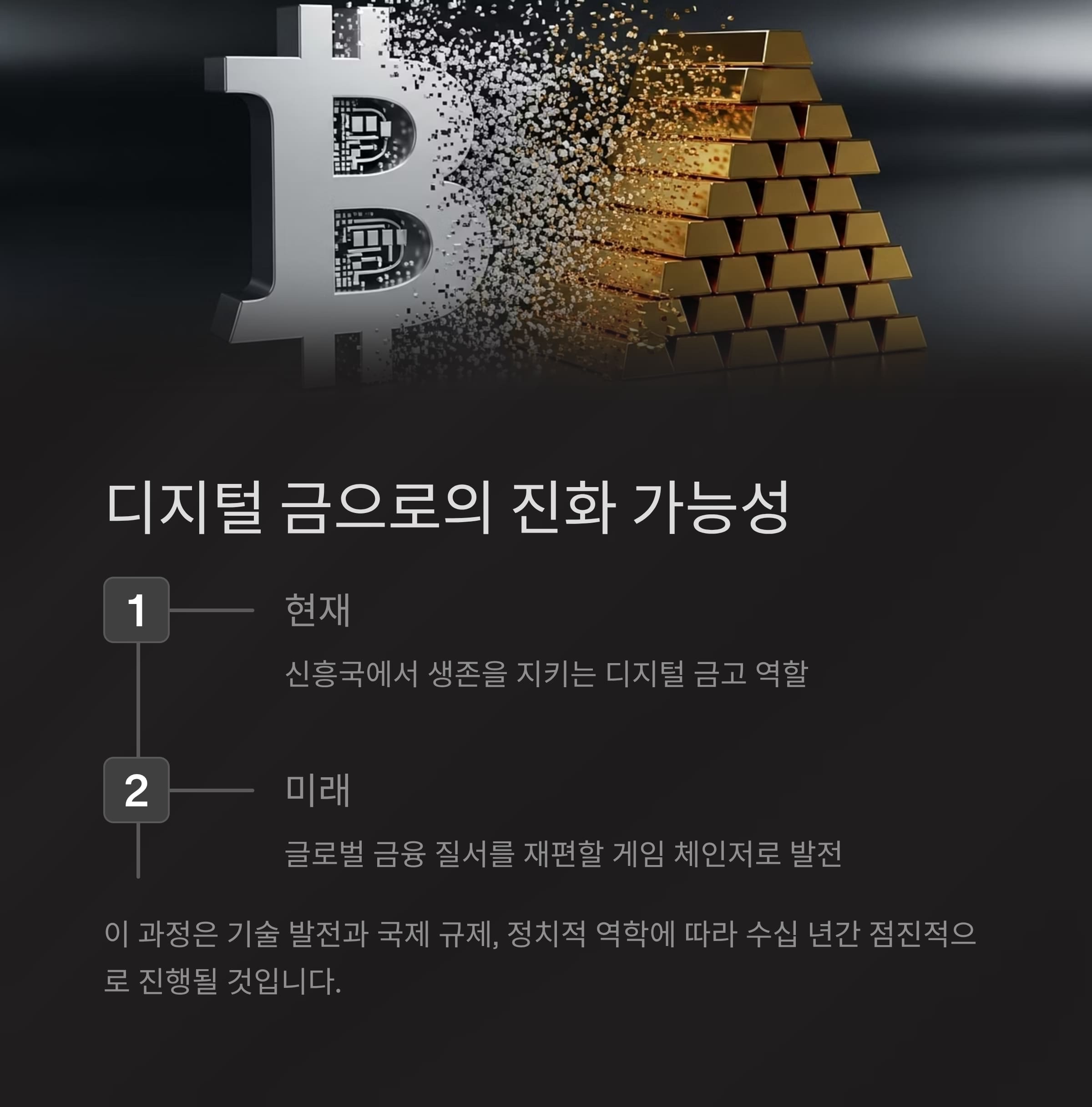| 특징 | 생존 도구 | 규제 강화 및 CBDC 부상 | 디지털 안전자산으로 진화 |