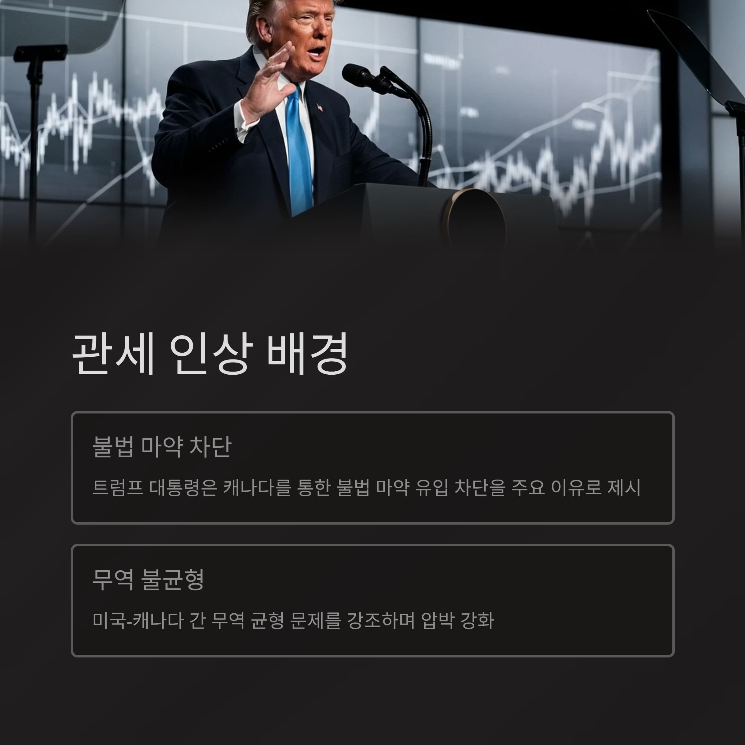 이번 관세 인상은 캐나다의 미국 요구에 대한 미온적 태도와 보복 관세 정책에 대한 대응으로 풀이됩니다.