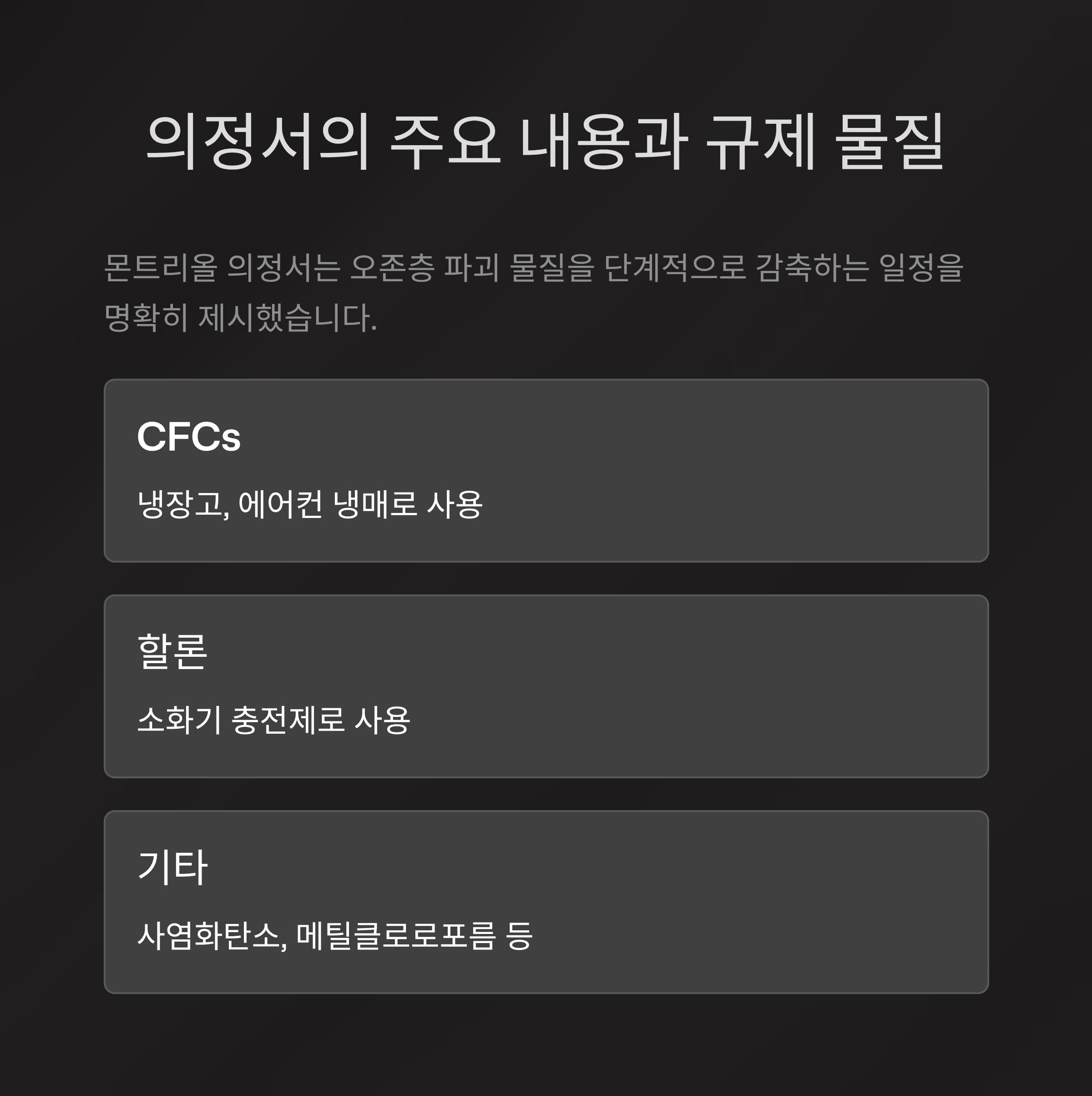 1987년 캐나다 몬트리올에서 채택되었으며, 환경 보존을 위한 국제 협력의 대표적 성공 사례로 꼽히고 있습니다.