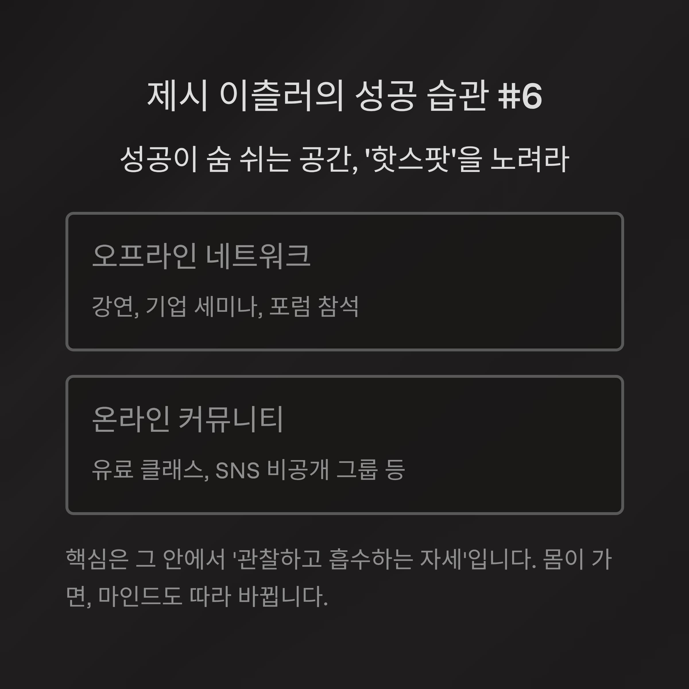 그들이 자주 찾는 장소, 모임, 커뮤니티는 성공 에너지로 가득합니다.