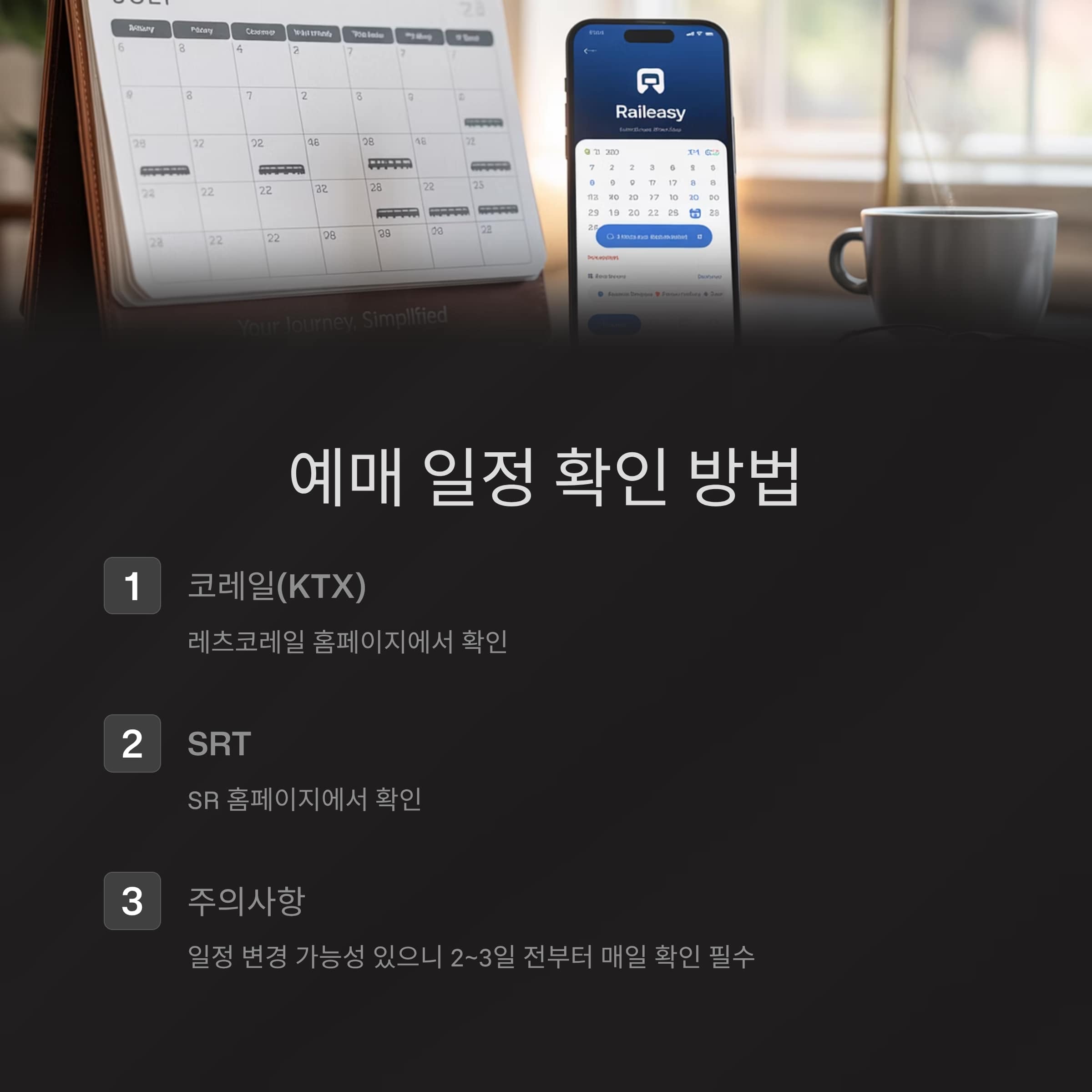 예매 일정은 코레일과 SRT 각각 다르게 운영되므로 반드시 구분해서 준비해야 합니다.