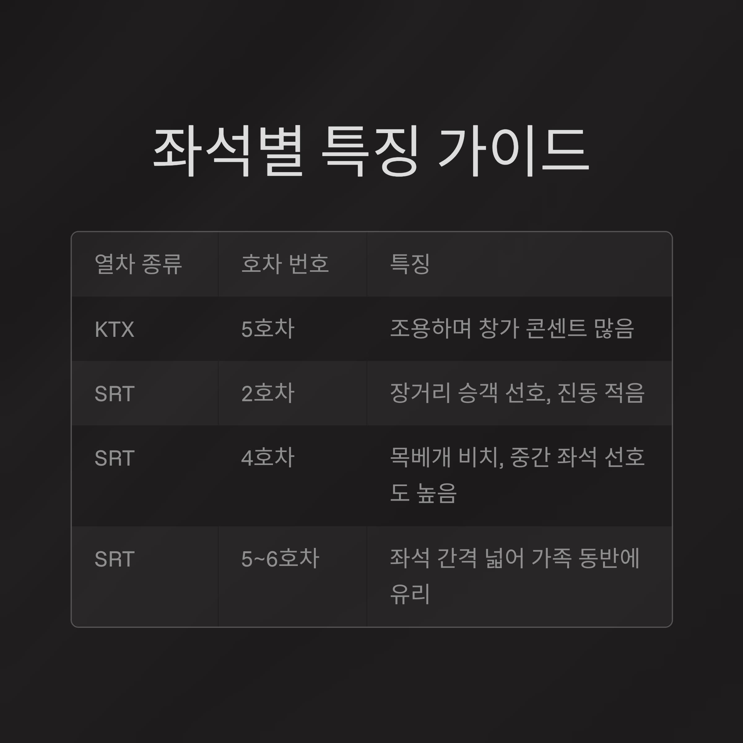 | SRT | 2호차 | 장거리 승객 선호, 진동 적음 |