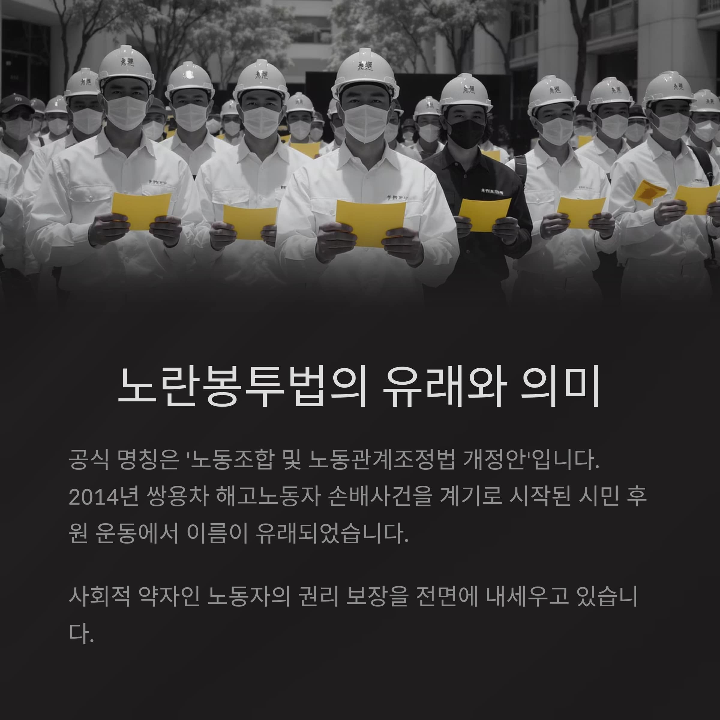 노란봉투법은 공식 명칭으로 ‘노동조합 및 노동관계조정법 개정안’을 뜻합니다.