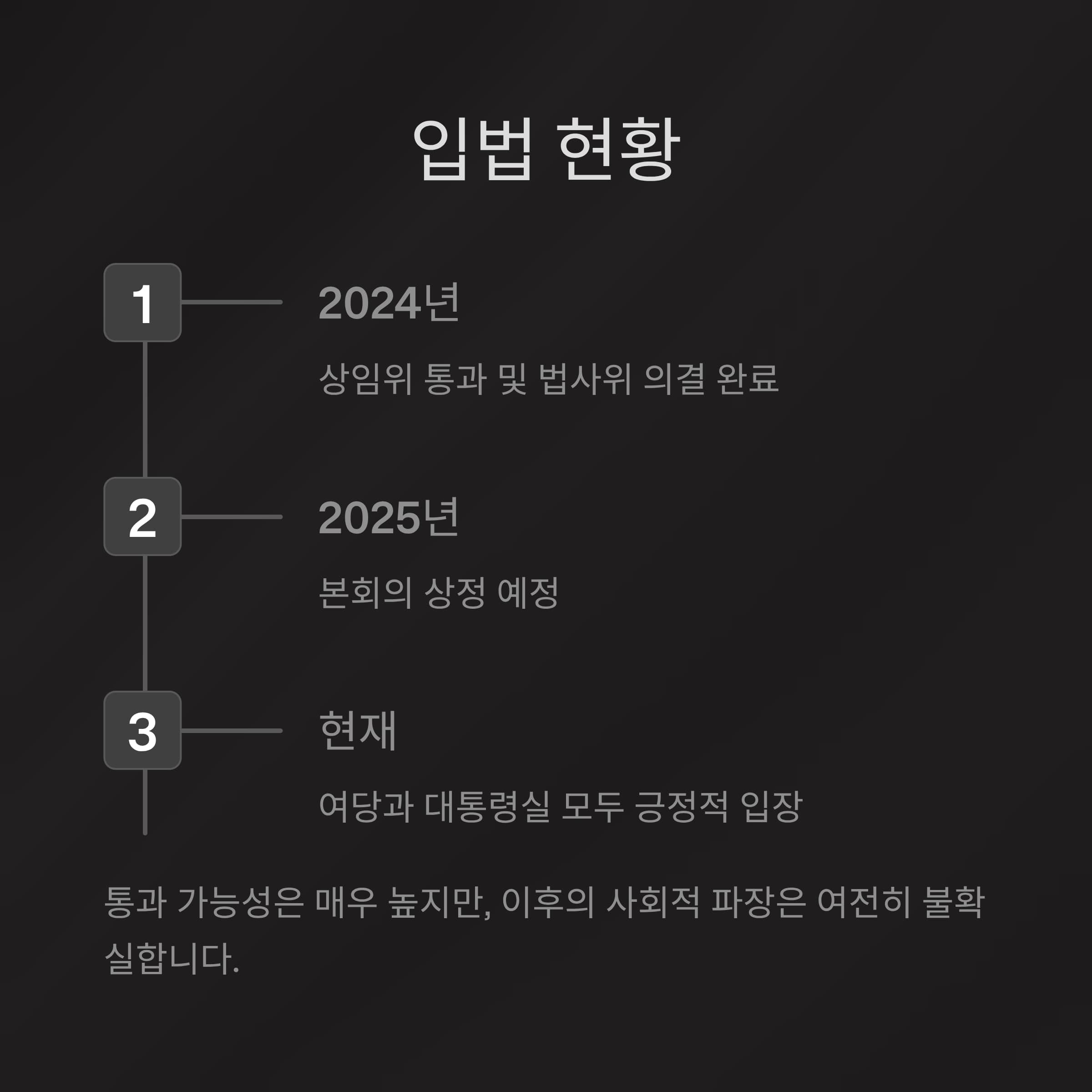 핵심 목적으로 합니다. 2025년 8월 현재 국회 본회의 통과만을 남겨둔 이 법은