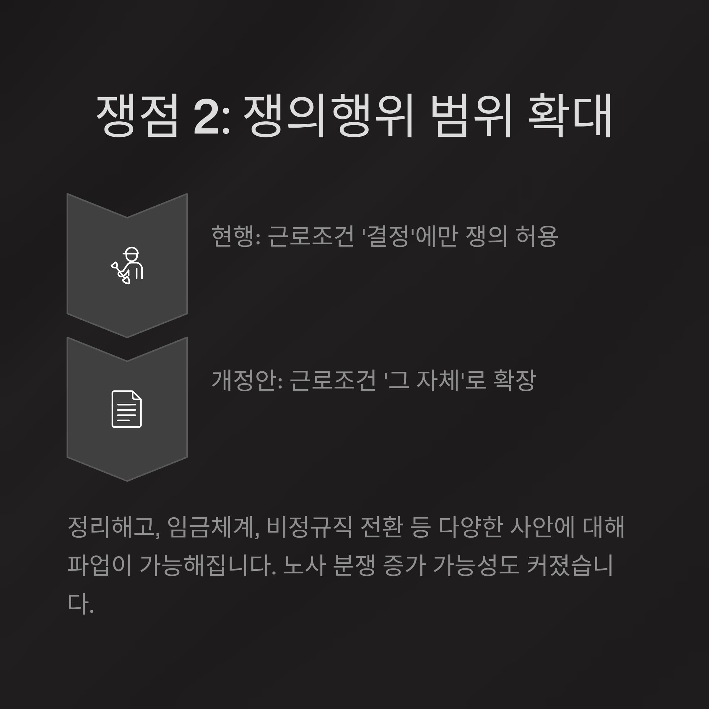 쟁의 가능 사안이 확대되면서 실제 노사 분쟁이 증가할 가능성도 커졌습니다.