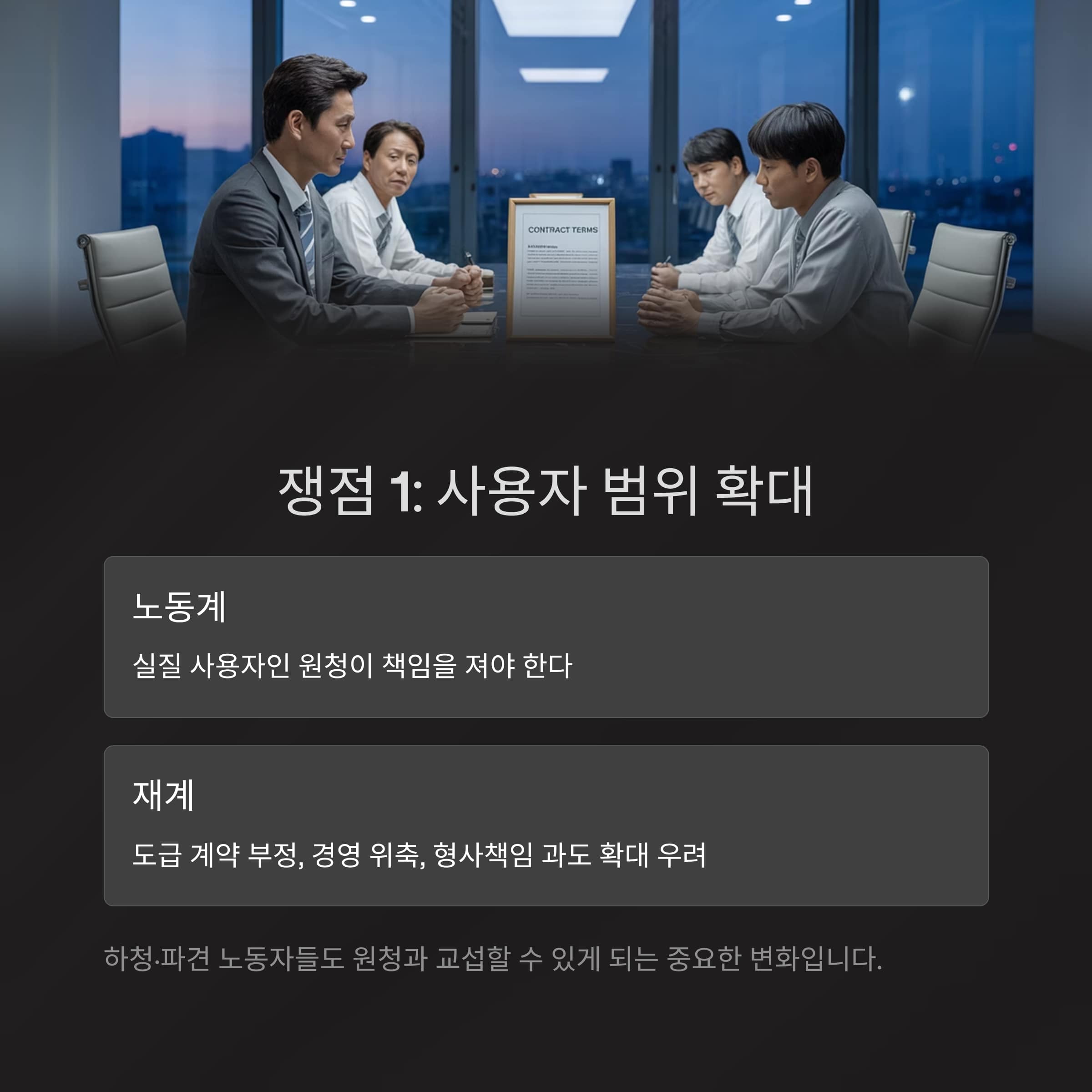 가장 큰 논쟁 지점은 사용자 범위 확대입니다. 기존에는 근로계약을