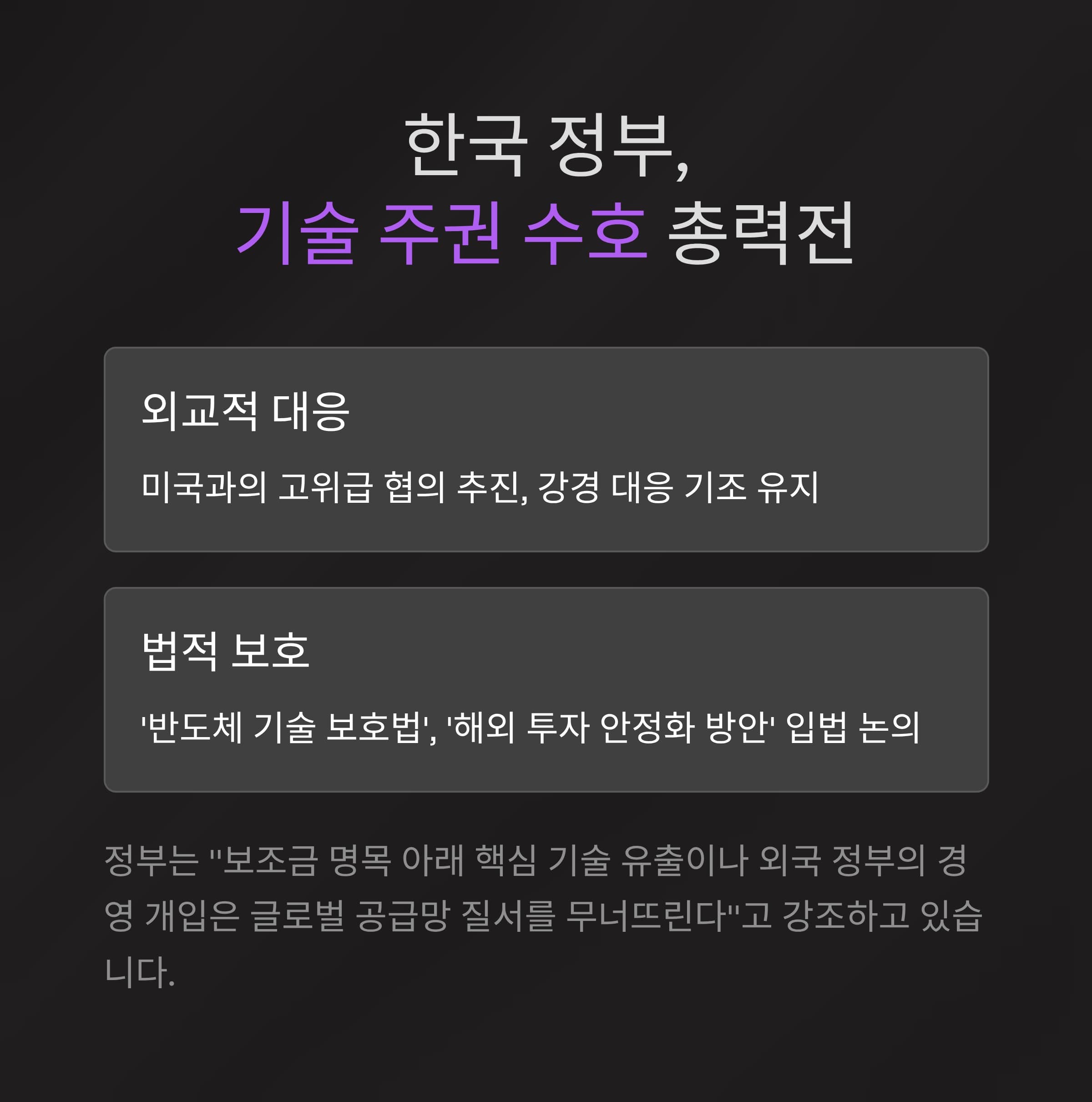 한국 정부는 이번 미국 정부의 지분 요구 발표에 대해 즉각 우려를 표명하고, 외교적 채널을 통해 강경 대응 기조를 유지하고 있습니다. 산업통상자원부를 비롯한 관계 부처는 "국내 기업의 기술과 경영 자율성은 반드시 보호돼야 한다"는 입장을 명확히 하고, 미국과의 고위급 협의를 추진 중입니다.
