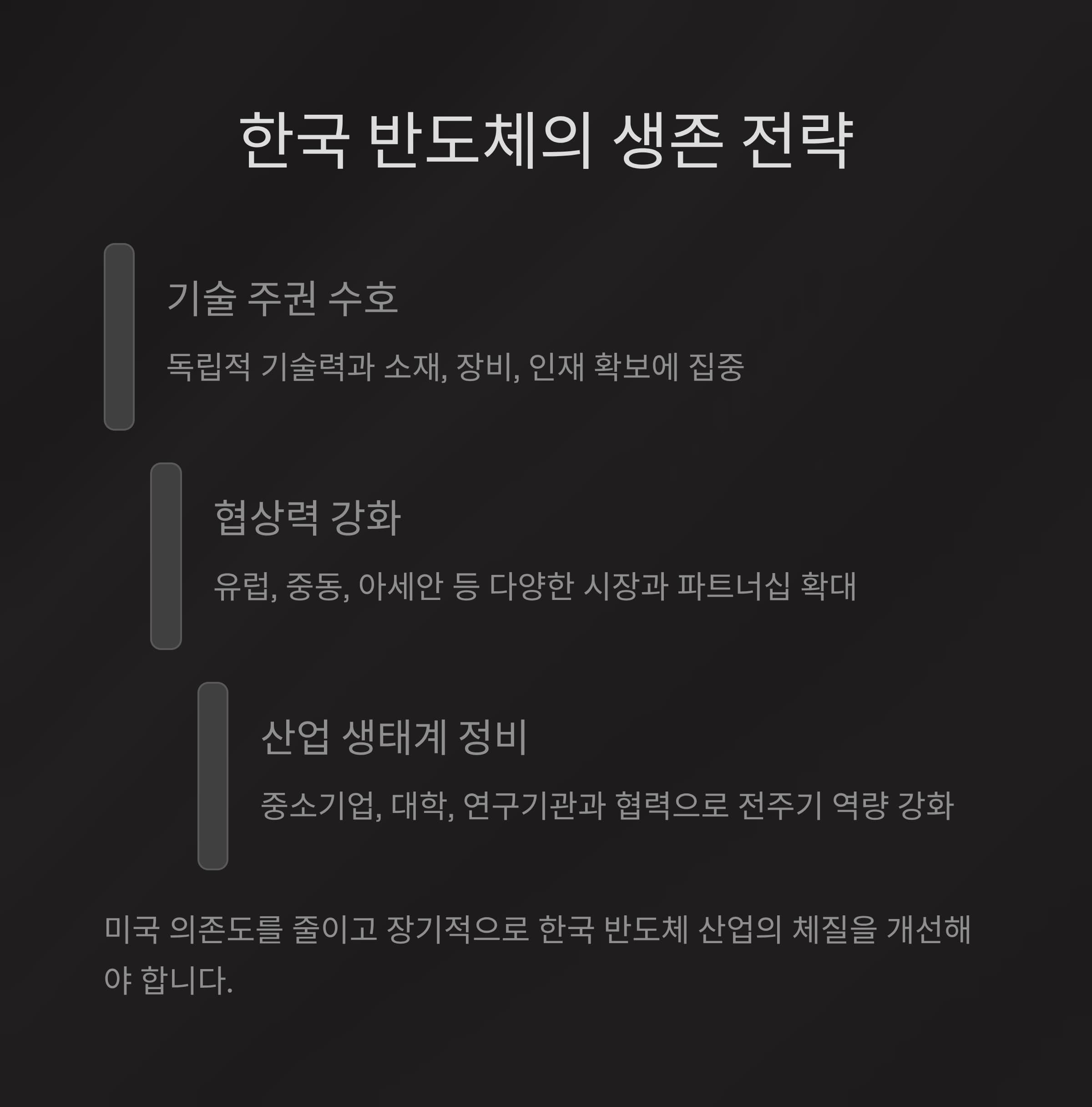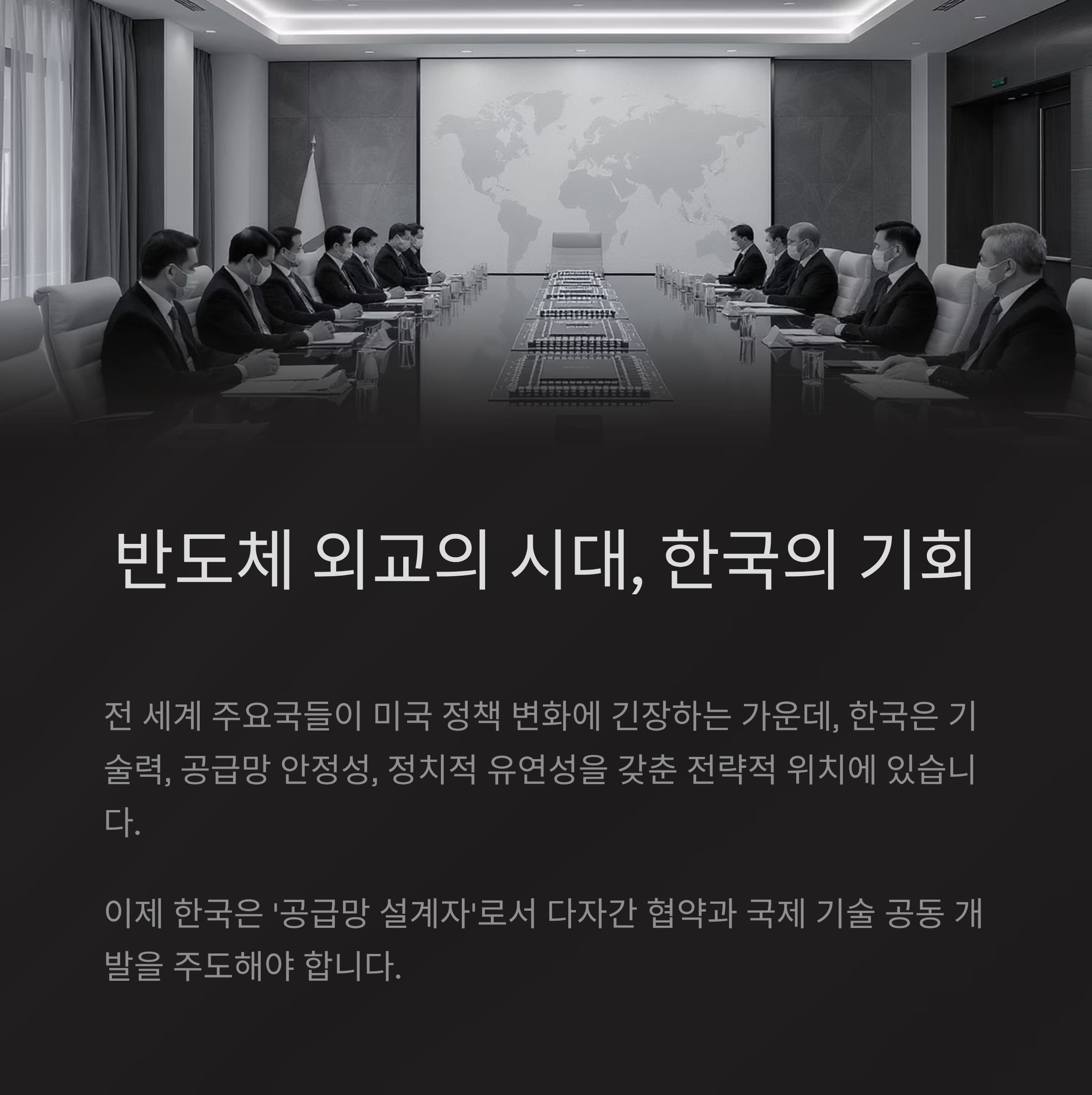 이러한 글로벌 전략을 체계화한다면, 한국은 반도체 산업에서 단순한 생산기지를 넘어서, 글로벌 협상의 ‘키 플레이어’로 부상할 수 있습니다.
