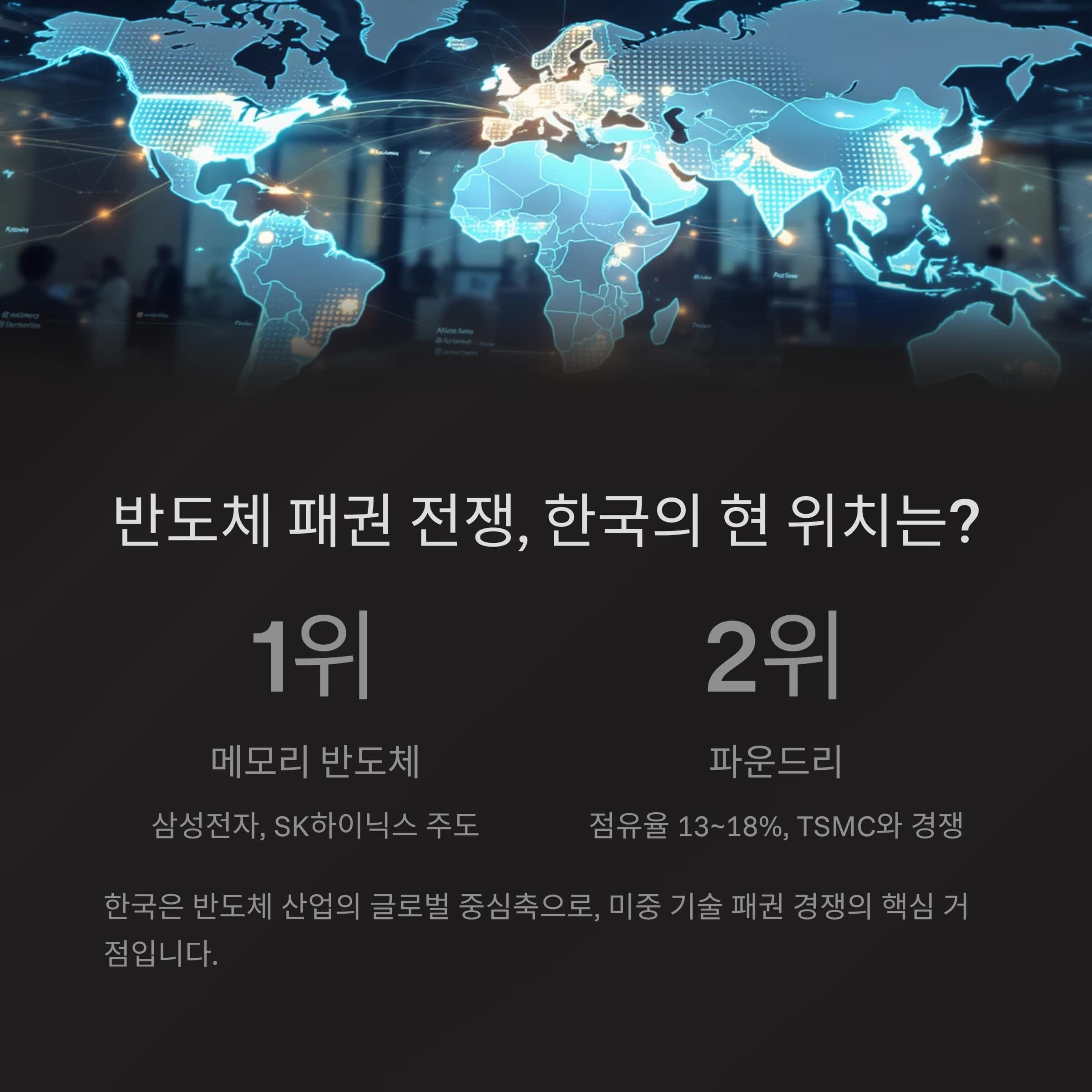 이처럼 한국은 반도체 산업에서 명실상부한 글로벌 중심축이자, 미국과 중국이 벌이는 기술 패권 경쟁의 핵심 거점으로 떠올랐습니다. 미국은 한국 기업을 통해 자국 반도체 생산기반을 강화하려 하며, 동시에 중국과의 기술 격차를 유지하려는 전략을 펴고 있습니다.