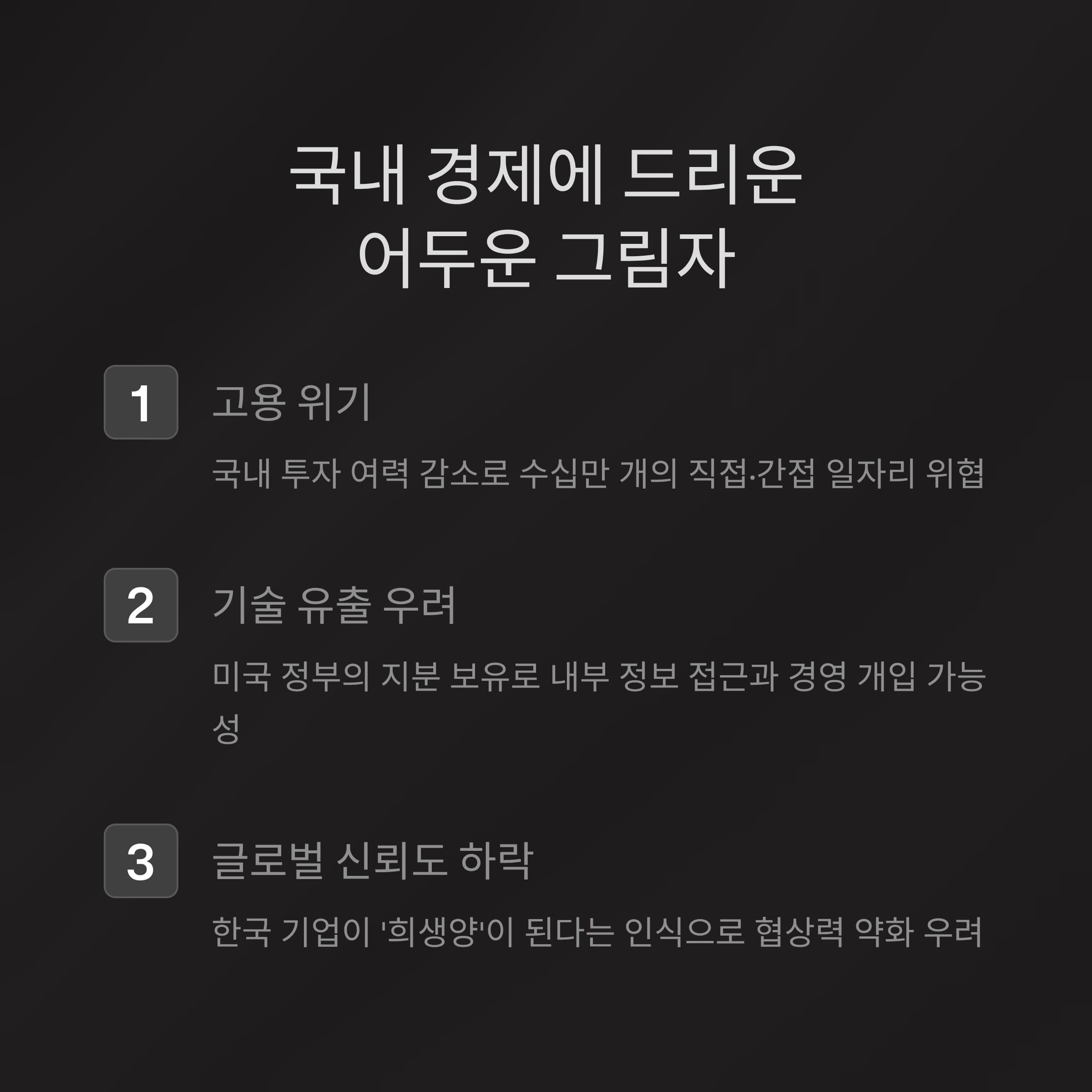 또한 경영권 침해 가능성과 기술 유출 우려도 매우 큽니다. 미국 정부가 보유한 지분을 통해 내부 정보에 접근하거나 경영 방향에 개입할 경우, 기업의 독립성과 전략적 판단 능력이 훼손될 수 있습니다. 이는 한국 기업이 글로벌 경쟁에서 주도권을 잃게 만들 수 있는 중대한 리스크입니다.