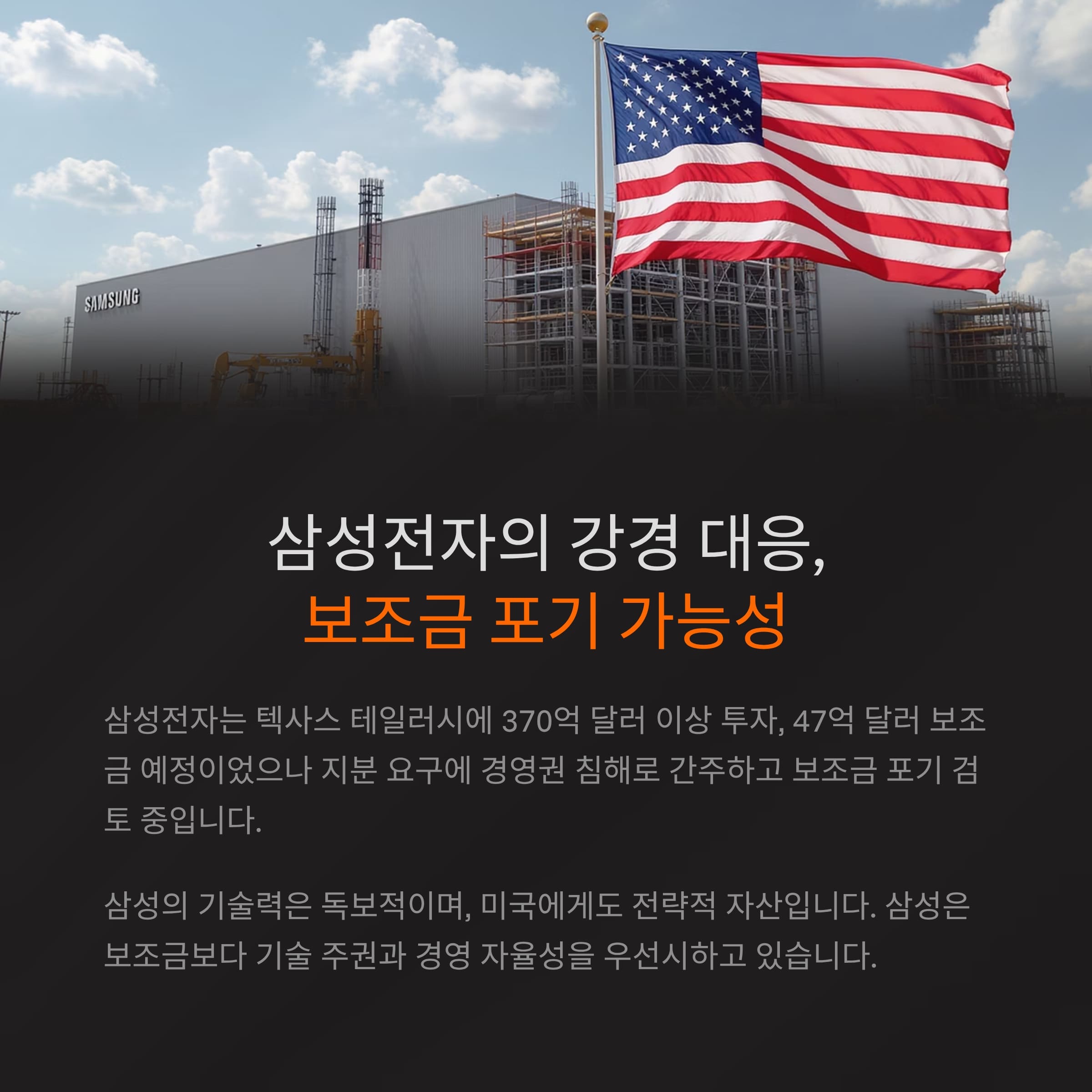 삼성전자는 현재 미국 텍사스 테일러시에 370억 달러 이상을 투자해 최첨단 파운드리 공장을 건설 중이며, 이에 대한 보조금으로 약 47억 달러를 받을 예정이었습니다. 하지만 지분 요구 방침이 공식화되면서 삼성 측은 심각한 경영권 침해로 간주하고, 보조금을 포기하거나 투자를 전면 재검토하겠다는 입장을 내부적으로 논의 중입니다.
