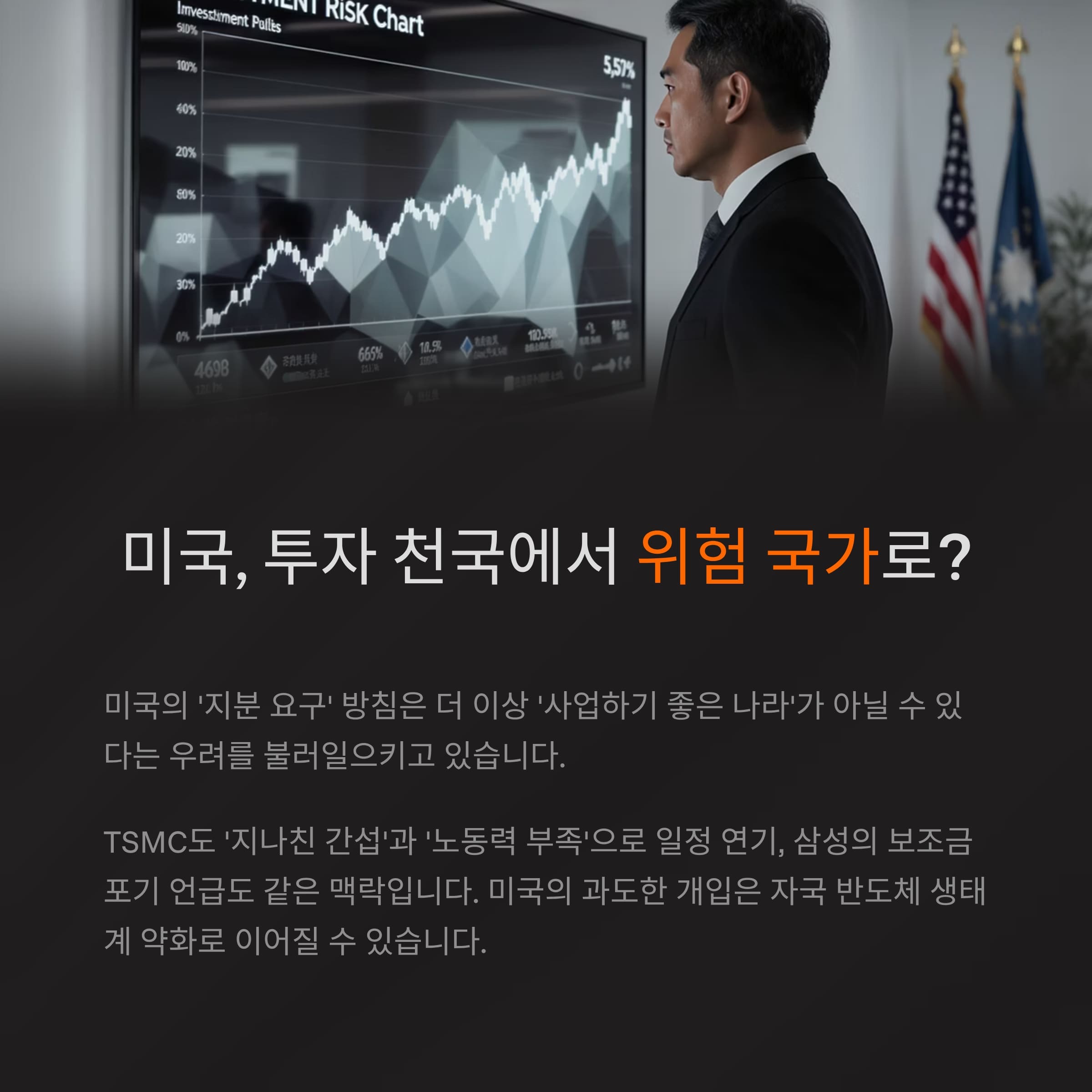 문제는 이러한 방식이 시장 경제의 근간을 흔들고, 글로벌 투자 신뢰를 무너뜨릴 수 있다는 점입니다. 전 세계적으로 유례를 찾기 어려운 이번 발표는 반도체 산업을 넘어, 향후 미국의 산업 정책 신뢰도에 큰 시험대가 될 전망입니다.