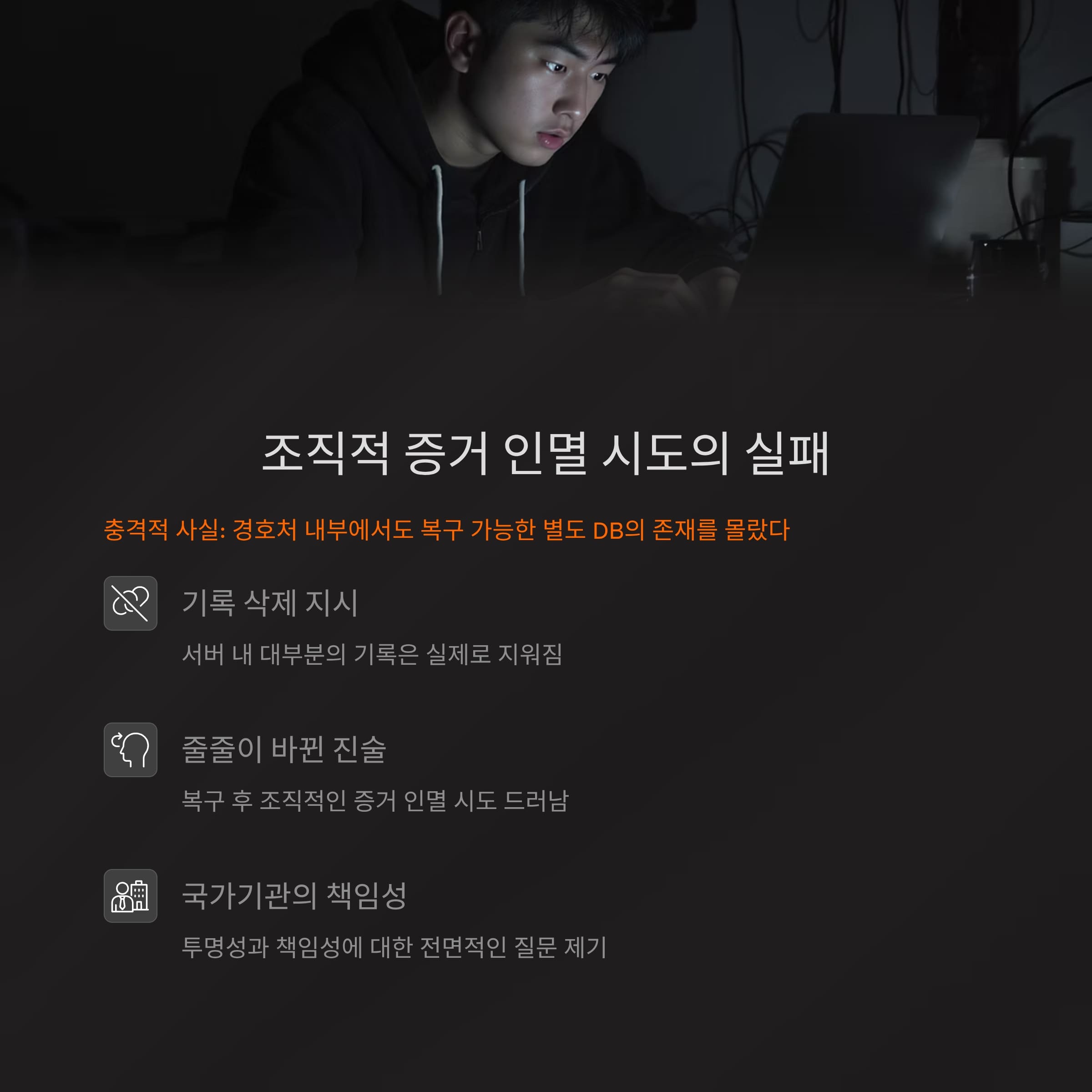 "그때의 통화가 있었고, 삭제 지시가 내려왔다"는 자백은 이후 수사에 큰 전환점을 만들어냈습니다.
