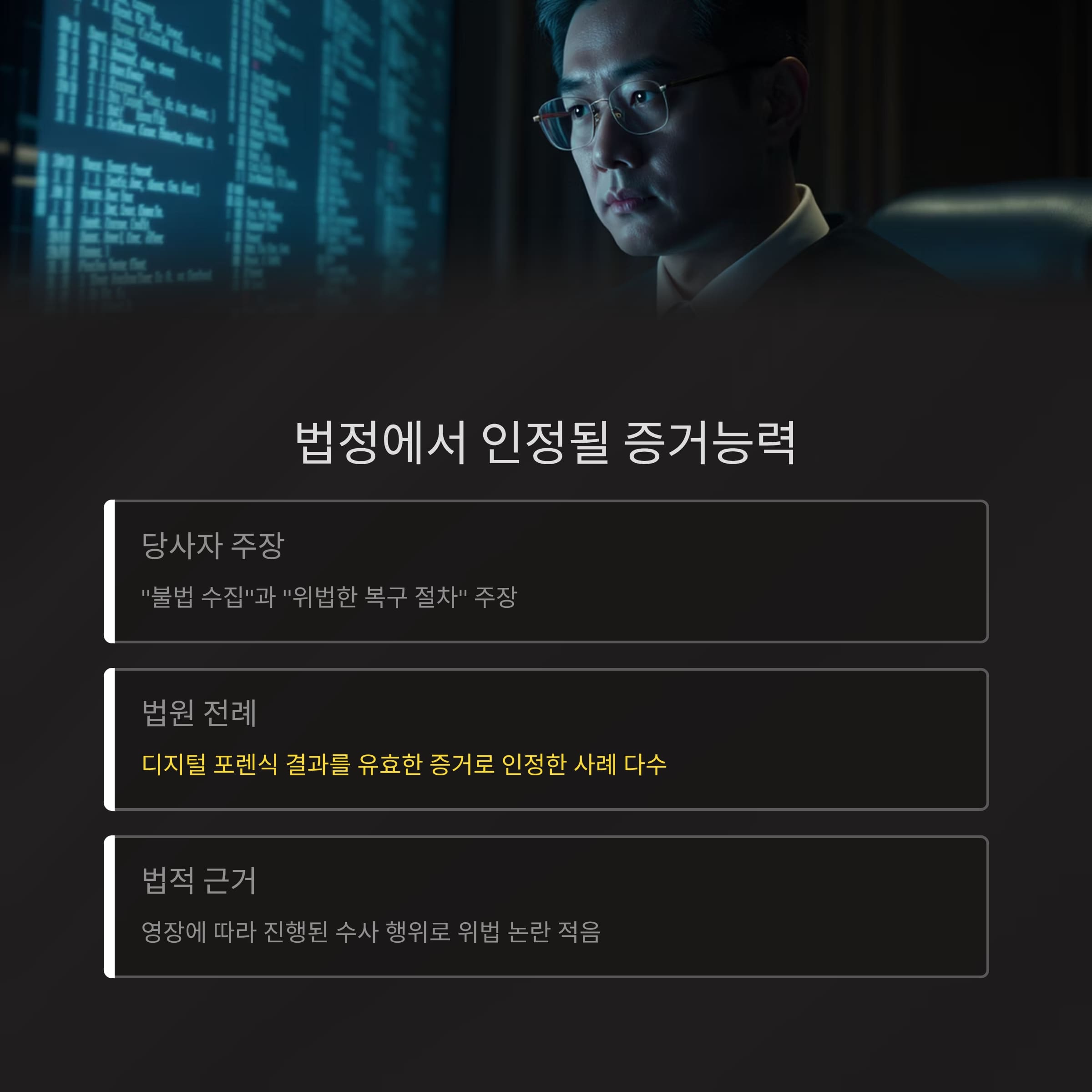 당사자들은 “불법 수집”과 “위법한 복구 절차”를 주장했지만, 법원은 이미 수차례 디지털 포렌식 결과를 유효한 증거로 인정한 전례가 있습니다.