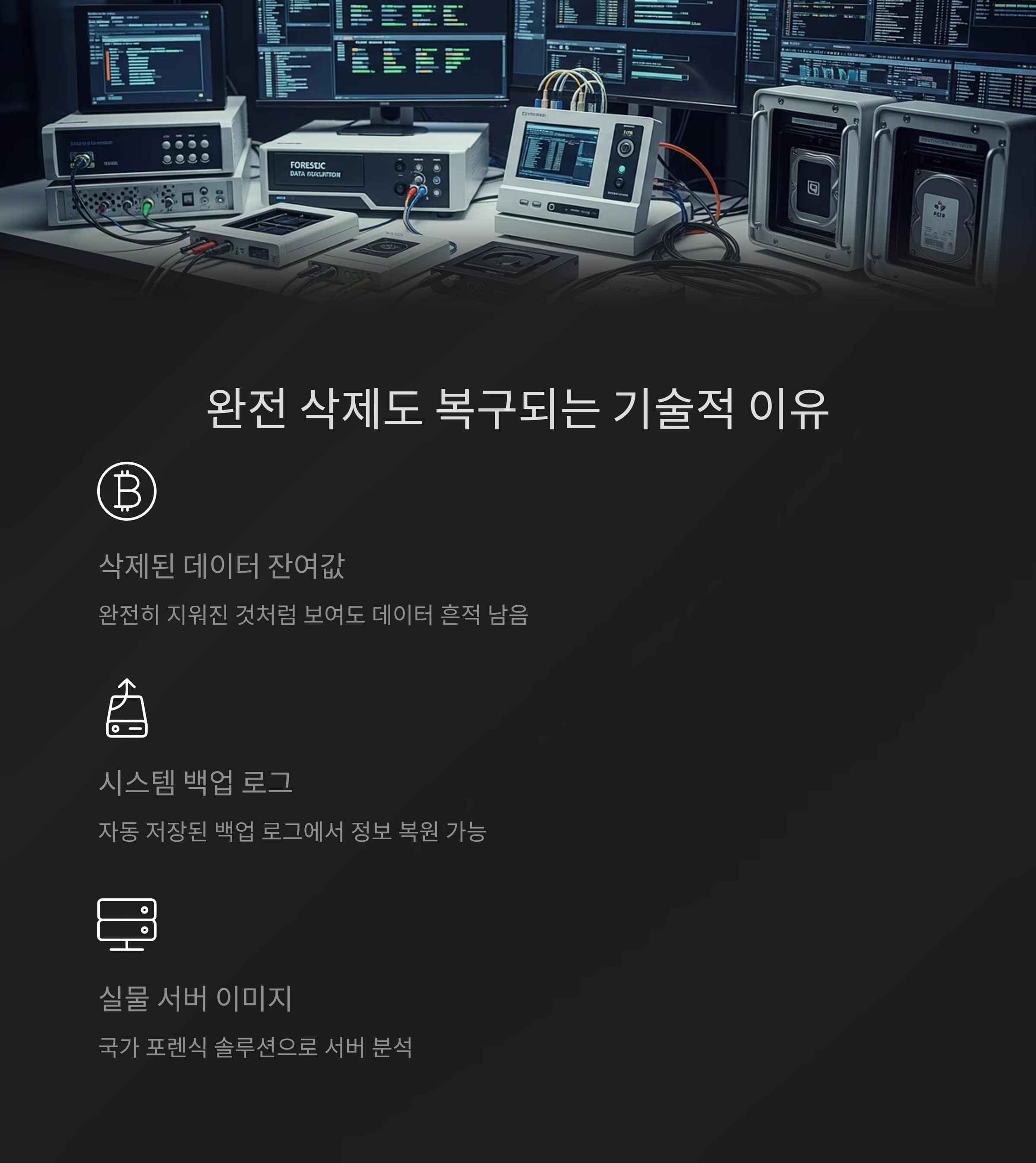 하지만 디지털 포렌식 기술은 삭제된 데이터의 일부 잔여값, 시스템 백업 로그, 실물 서버 이미지를 통해 정보를 복원합니다.