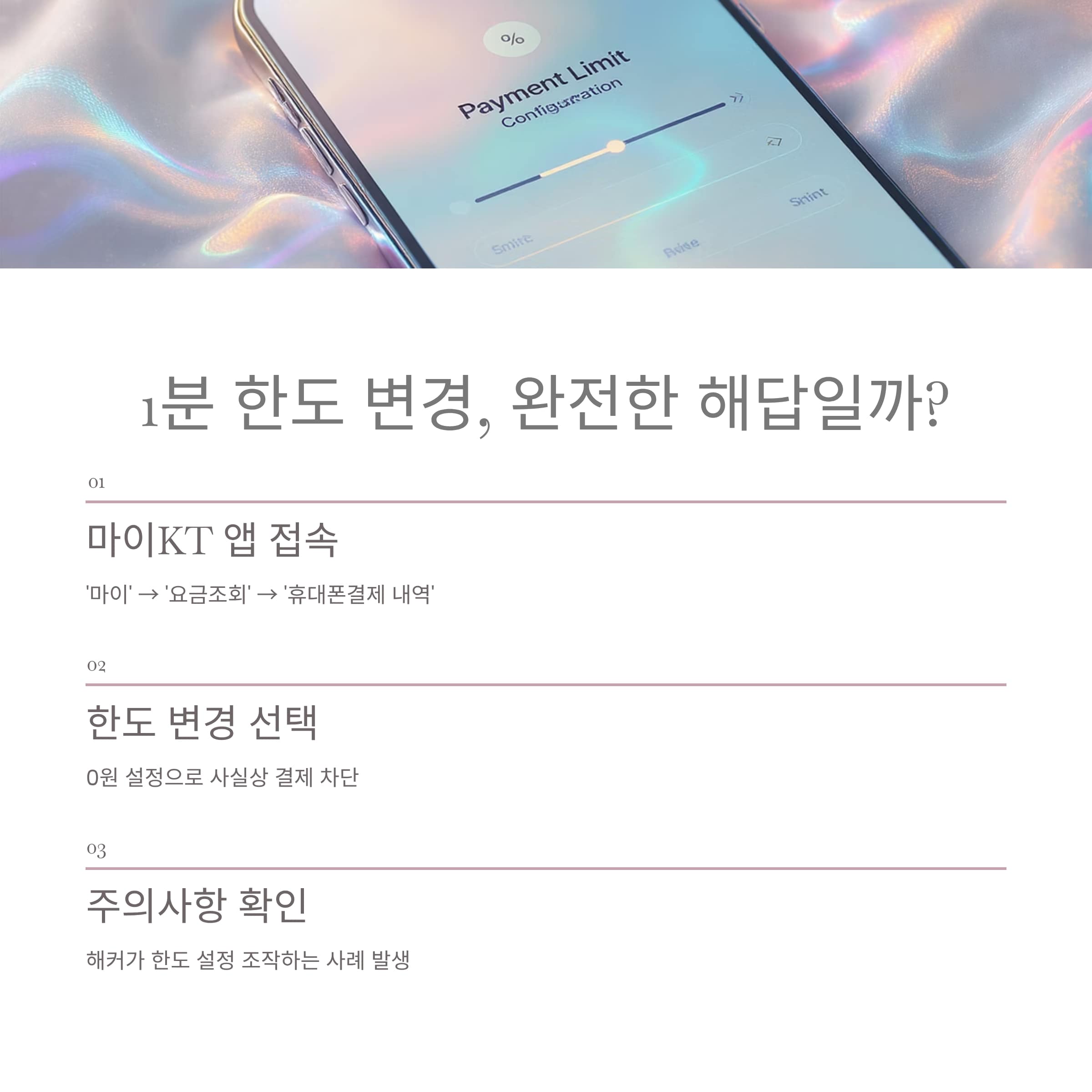 | 한도 0원 설정 | 마이KT 앱 또는 KT닷컴 웹사이트 | 사실상 결제 차단과 동일 |