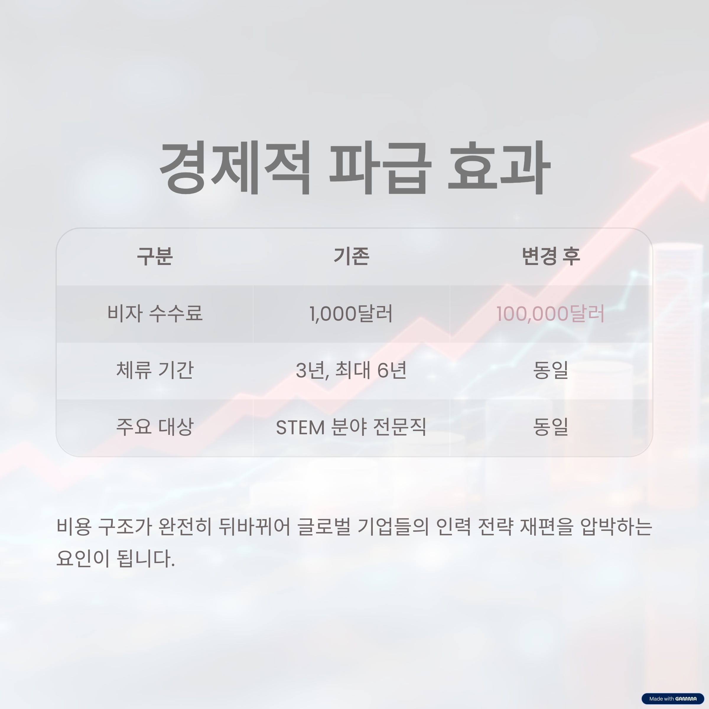 이 표에서 알 수 있듯, 체류 조건이나 대상에는 변화가 없지만 비용 구조가 완전히 뒤바뀌었다는 점이 핵심입니다. 이는 단순한 금액 문제가 아니라, 글로벌 기업들의 인력 전략 자체를 재편하도록 압박하는 요인이 될 수 있습니다.