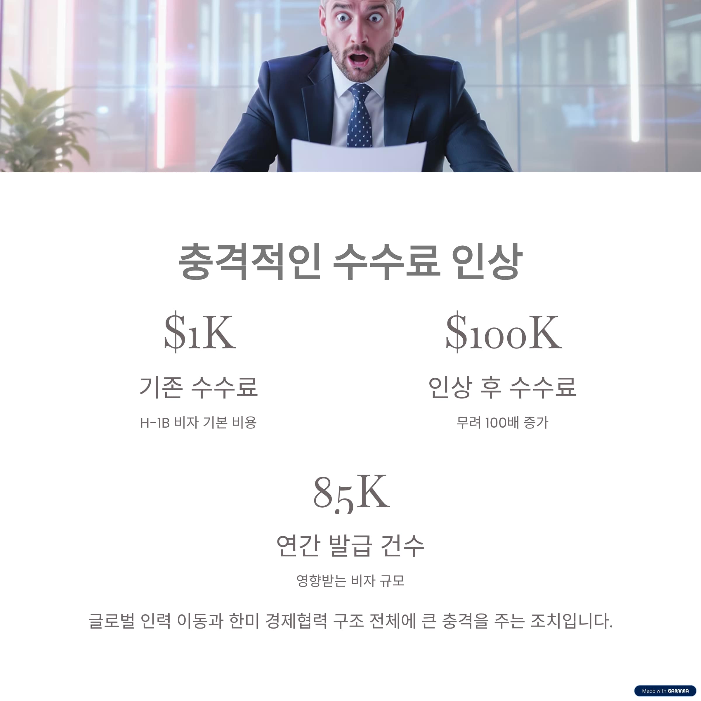 이번에 발표된 포고문에 따라 H-1B 비자 수수료는 기존 1,000달러에서 무려 10만 달러로 인상되었습니다.