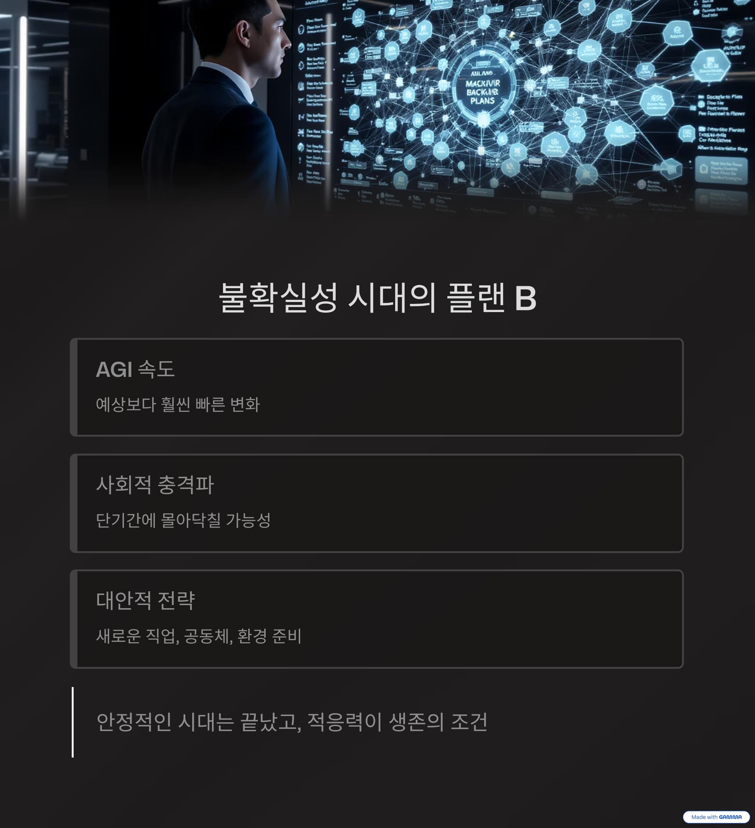 따라서 플랜 B, 즉 불확실성을 견딜 수 있는 대안적 삶의 전략을 마련해야 합니다. 새로운 직업, 새로운 공동체, 혹은 다른 지역·환경에서의 생존 전략까지 폭넓게 준비하는 것이 필요합니다.