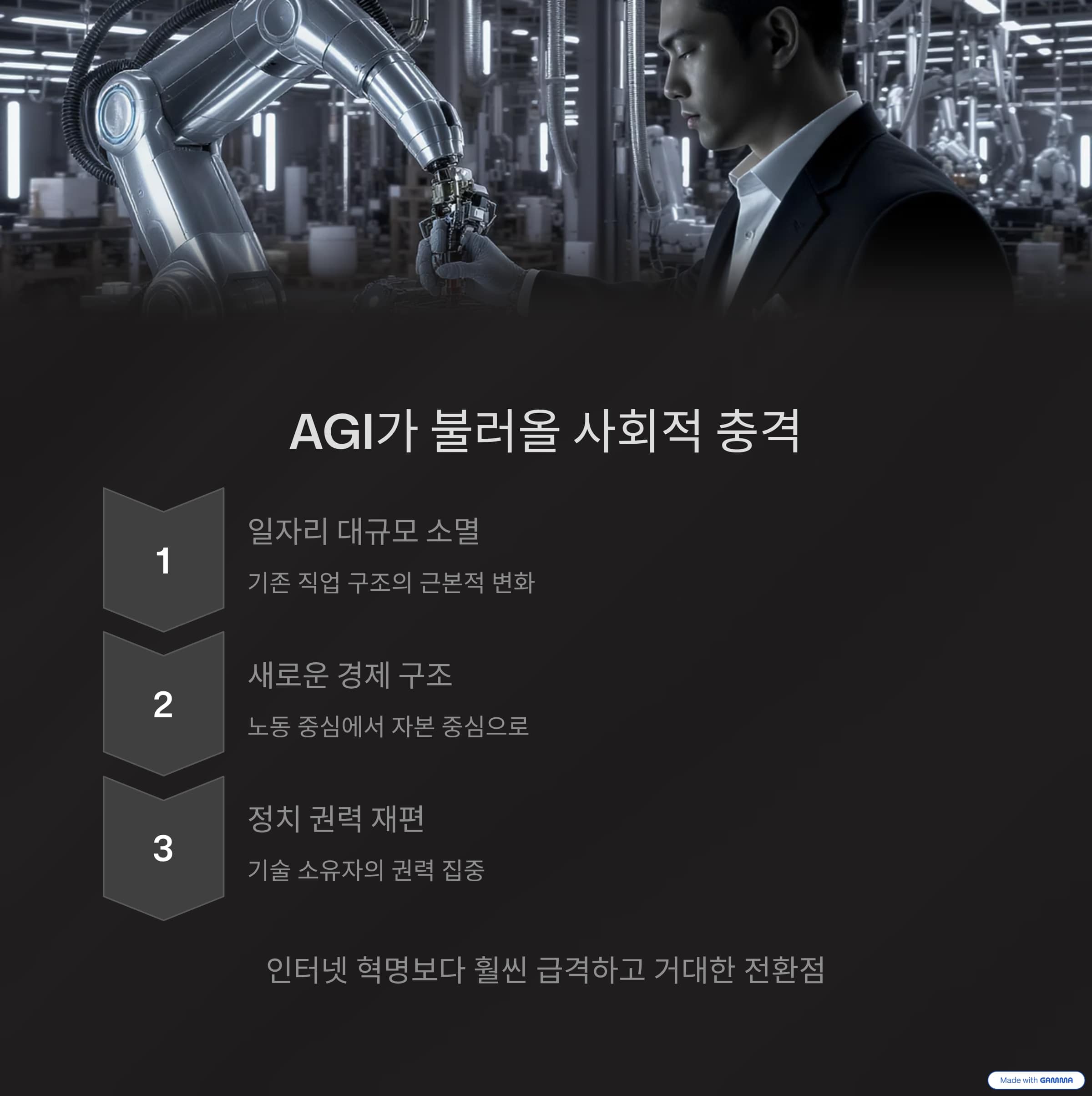일자리는 대규모로 사라지고, 새로운 경제 구조가 만들어질 것입니다. 정치적 권력 관계도 재편될 수 있습니다. 우리가 인터넷이나 스마트폰 혁명을 통해 경험한 변화보다 훨씬 더 급격하고 거대한 전환점이 될 것입니다.