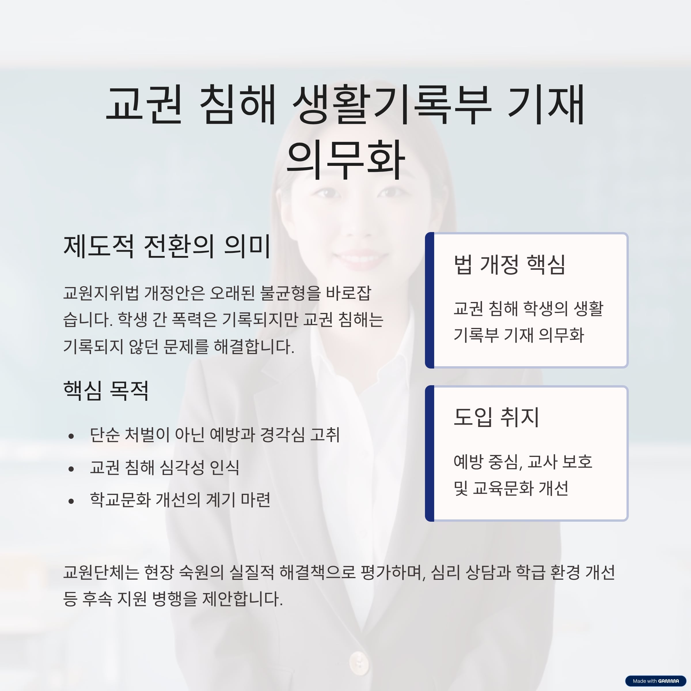 | 도입 취지 | 예방 중심, 교사 보호 및 교육문화 개선 |