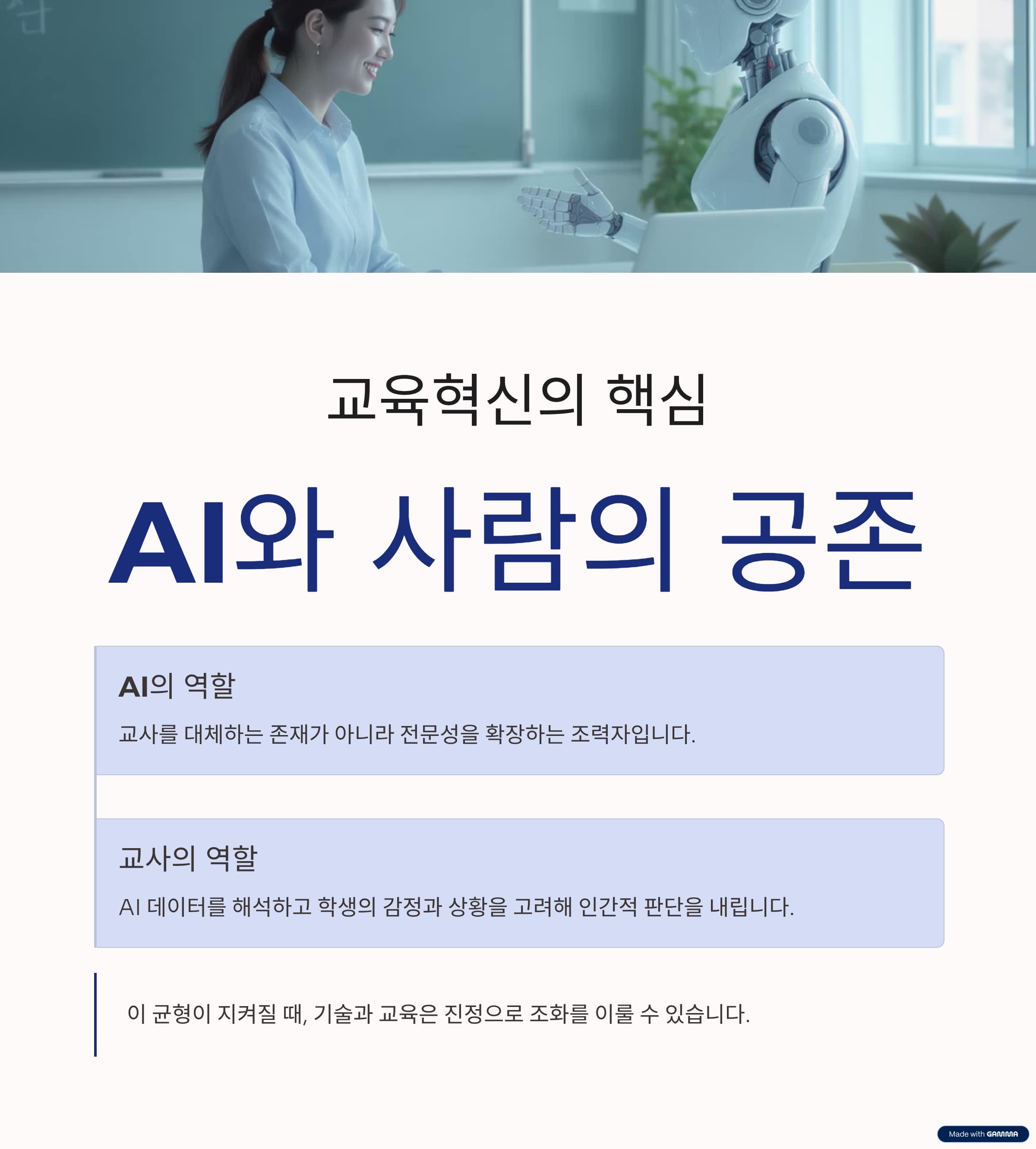 AI는 교사를 대체하는 존재가 아니라, 교사의 전문성을 확장하는 ‘조력자’입니다.