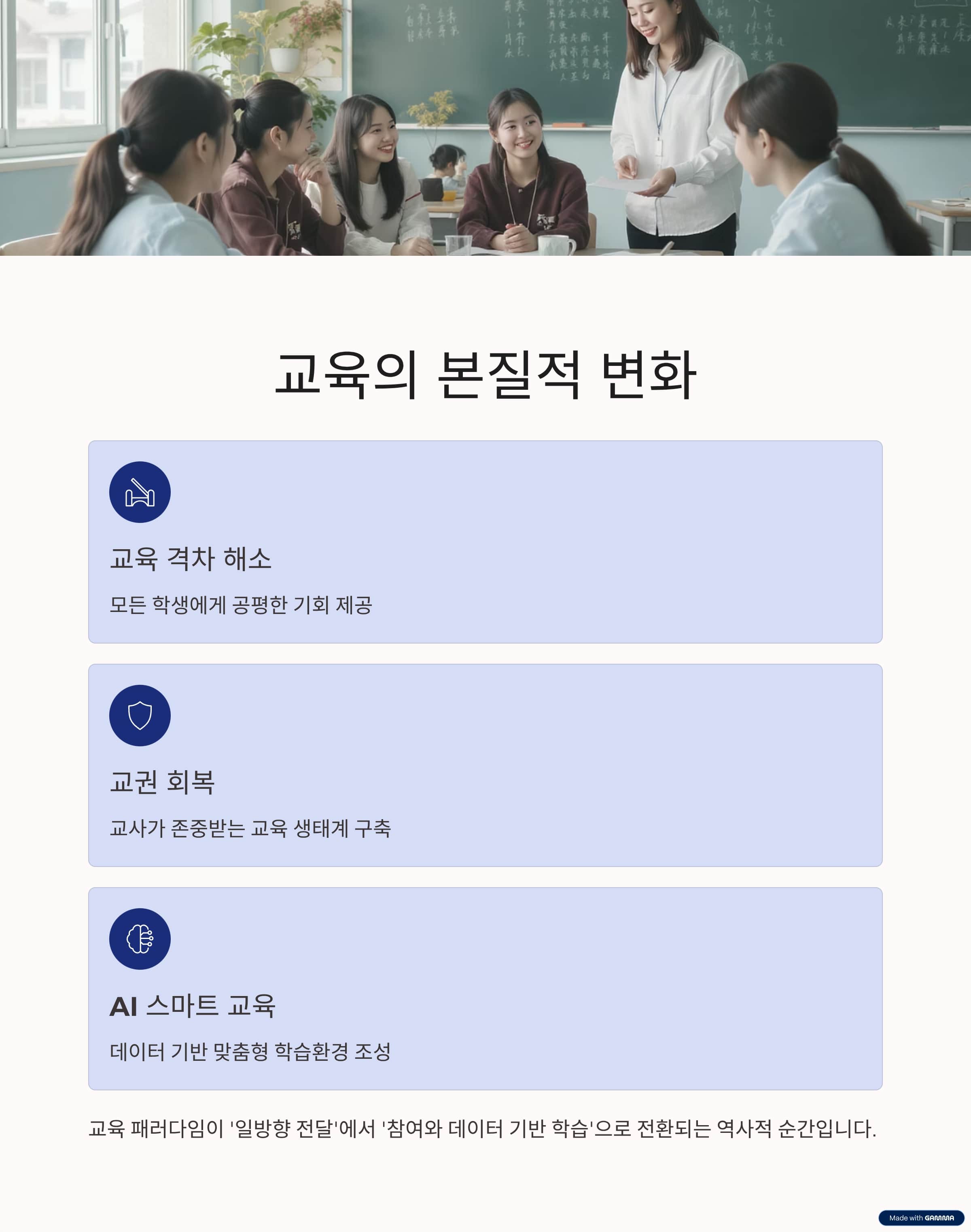 이 변화는 학생 개개인의 잠재력을 키우고, 교사가 존중받는 교육 생태계를 만드는 데 초점을 맞추고 있습니다.
