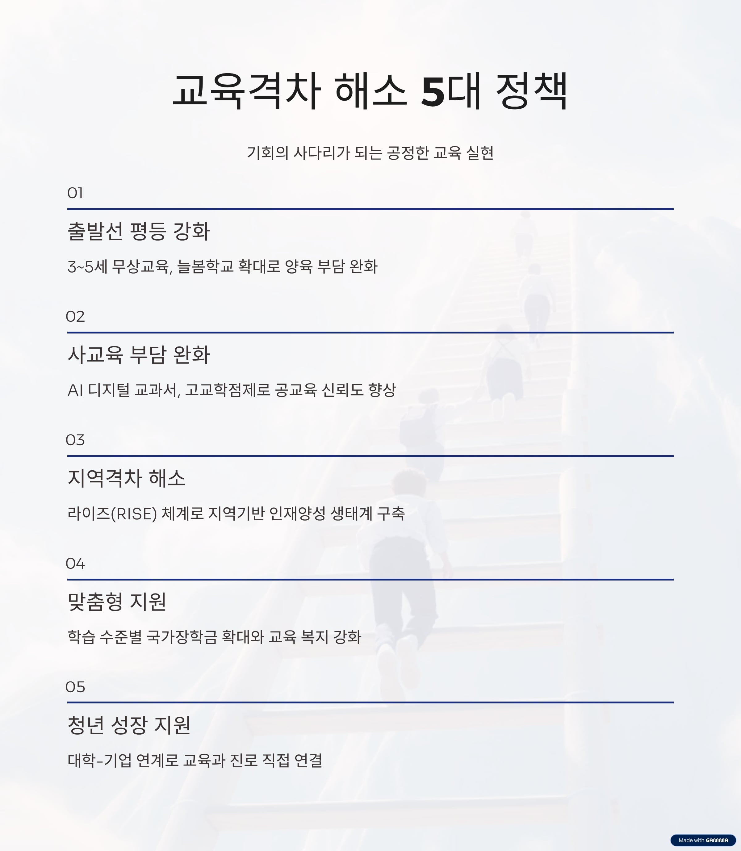 정부는 2025년을 ‘기회의 사다리가 되는 공정한 교육 실현의 원년’으로 선언했습니다.